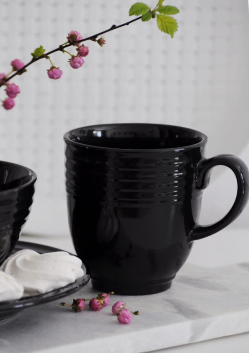Nasz komplet to połączenie funkcjonalności z minimalistycznym stylem, który sprawia, że każde śniadanie staje się wyjątkowym momentem. Kubek z uchem, miseczka oraz talerzyk tworzą spójną całość, w której liczy się każdy detal. Czarna barwa naczyń to klasyka, która nigdy nie wychodzi z mody, a delikatne cztery karbowania na powierzchni dodają subtelnej elegancji.