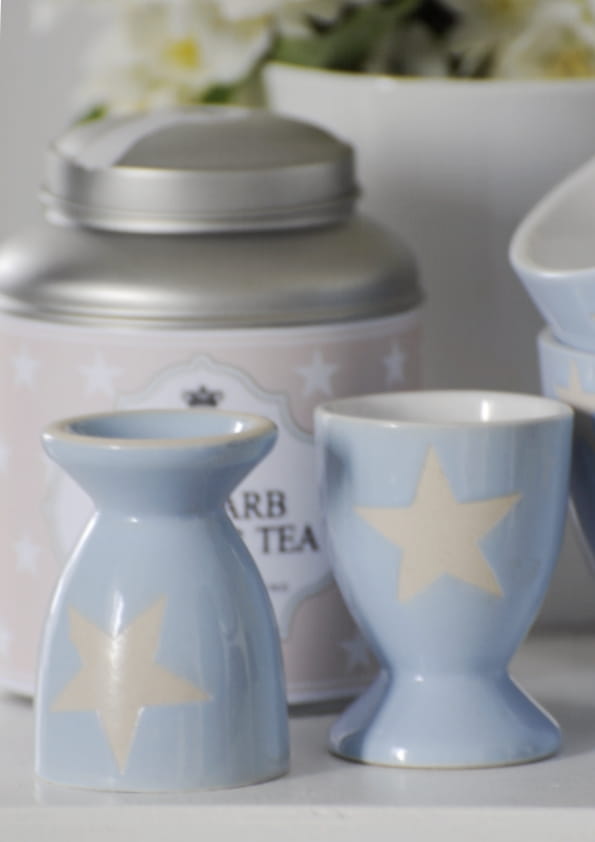Ceramiczny kieliszek na jajko w pastelowym odcieniu niebieskiego z delikatnym motywem gwiazdki. Estetyczny i funkcjonalny dodatek do śniadania, wykonany z trwałej ceramiki. Idealny do codziennego użytku oraz jako drobny prezent do kuchni.