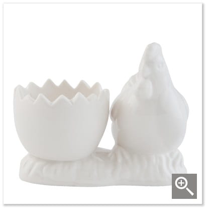 Ceramiczny kieliszek na jajko z motywem kury w kolorze białym. Dekoracyjny i funkcjonalny dodatek na stół, idealny do serwowania jajek oraz jako element wielkanocnej aranżacji. Wykonany z trwałej ceramiki, stabilny i łatwy w utrzymaniu czystości.