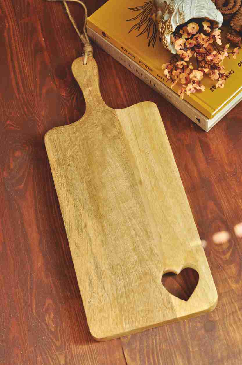 Duża deska kuchenna wykonana z drewna o ciepłej barwie to nie tylko praktyczne narzędzie kuchenne, ale również estetyczny element wyposażenia kuchni. Jej główną cechą jest komfortowe użytkowanie, a ozdobny element w postaci wyciętego serduszka dodaje uroku i oryginalności.
