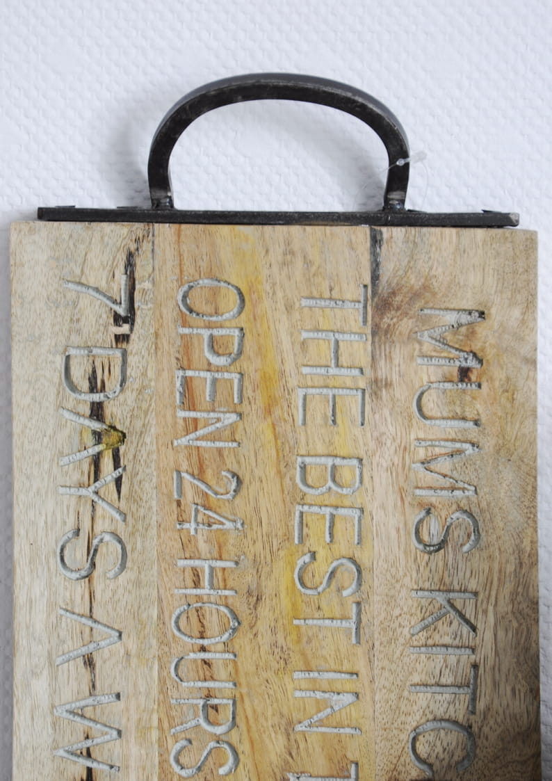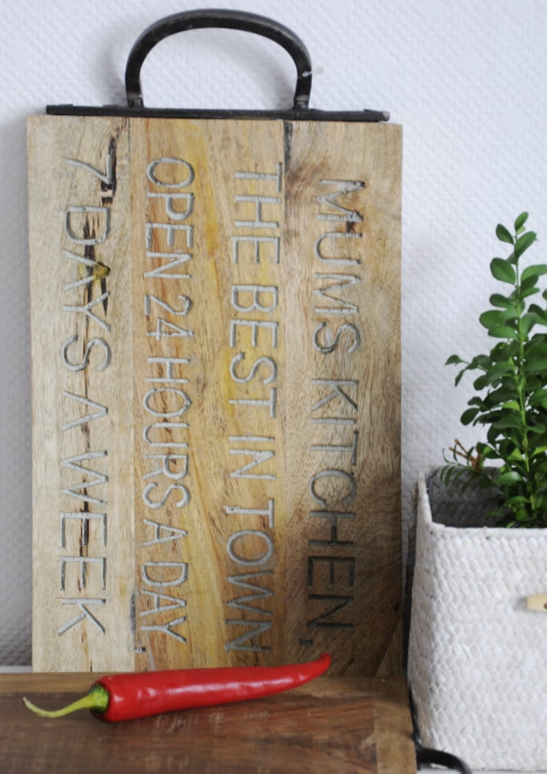 Deska kuchenna z metalowym uchwytem i ozdobnymi napisami – praktyczność połączona z elegancją
