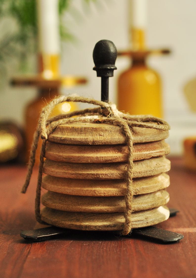 Okrągłe drewniane podstawki pod kubki na metalowym stojaku ROUND