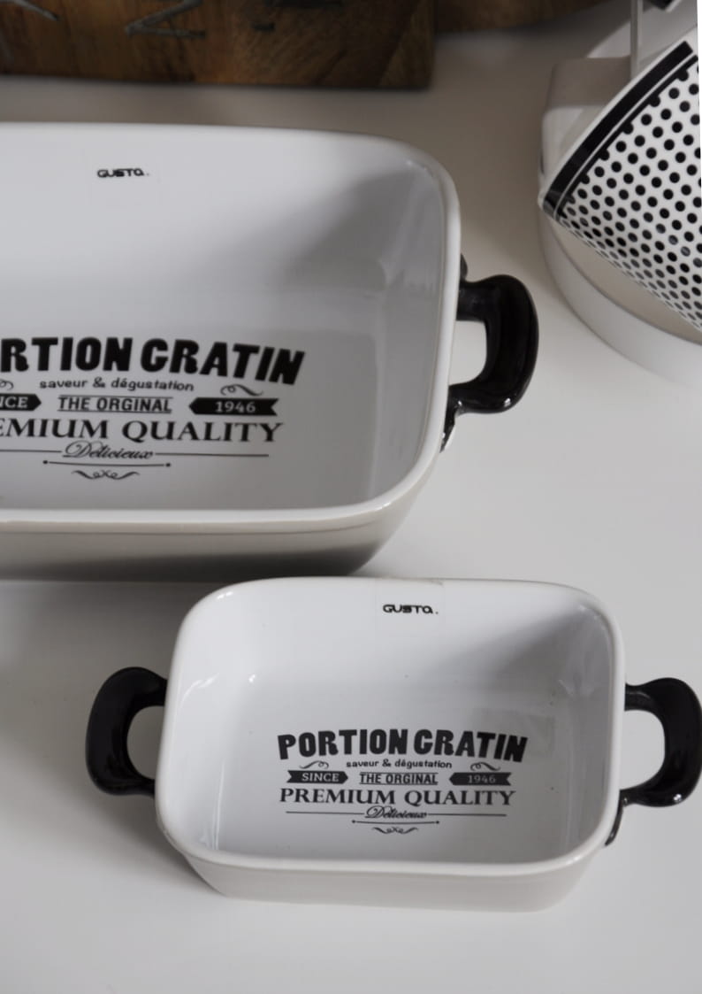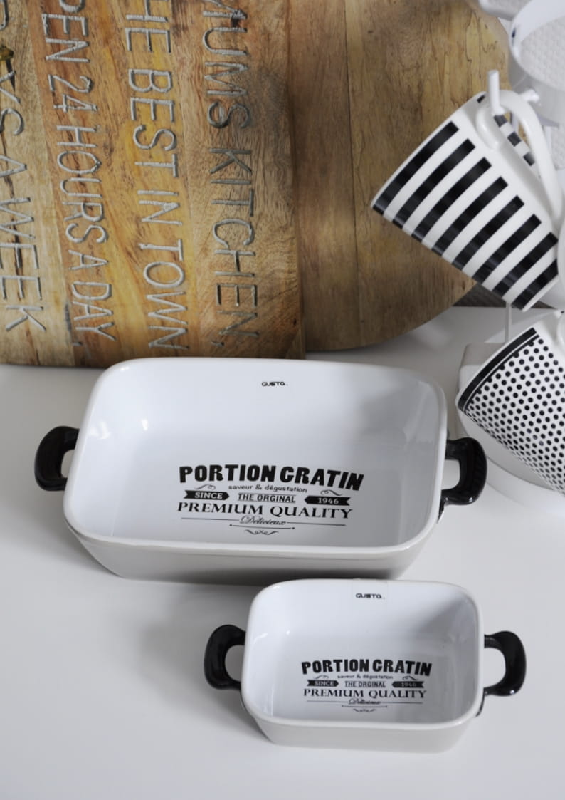 Ten komplet naczyń do zapiekania to połączenie praktyczności i ponadczasowego designu. Wykonany z wysokiej jakości szkliwionej ceramiki, gwarantuje równomierne rozprowadzanie ciepła, dzięki czemu Twoje dania będą doskonale zapieczone. Zewnętrzna szara barwa naczynia oraz biały środek nadają mu elegancki charakter, a czarne uchwyty i dekoracyjny tekst stanowią piękny akcent.