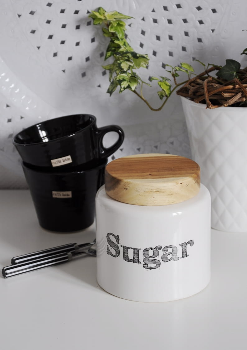 Dodaj swojej kuchni wyjątkowego uroku dzięki pojemnikowi na cukier z drewnianym wieczkiem. To nie tylko praktyczny sposób na przechowywanie cukru, ale również stylowa dekoracja. Wykonany z białej ceramiki i ozdobiony subtelnym czarnym napisem, doskonale wpisuje się w nowoczesne i klasyczne wnętrza. Naturalne drewniane wieczko z gumową uszczelką zapewnia świeżość przechowywanej zawartości.