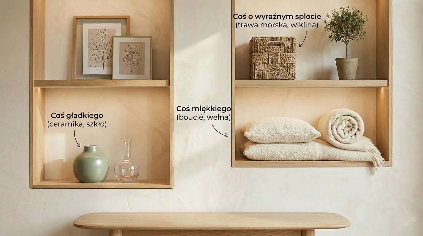 Zasada 3 faktur: Aby uniknąć nudy zestaw ze sobą: coś gładkiego (ściana/szkło), coś miękkiego (len/wełna) i coś o wyraźnym splocie (trawa morska/rattan). To połaczenie buduje głębię bez wprowadzania kolorów.