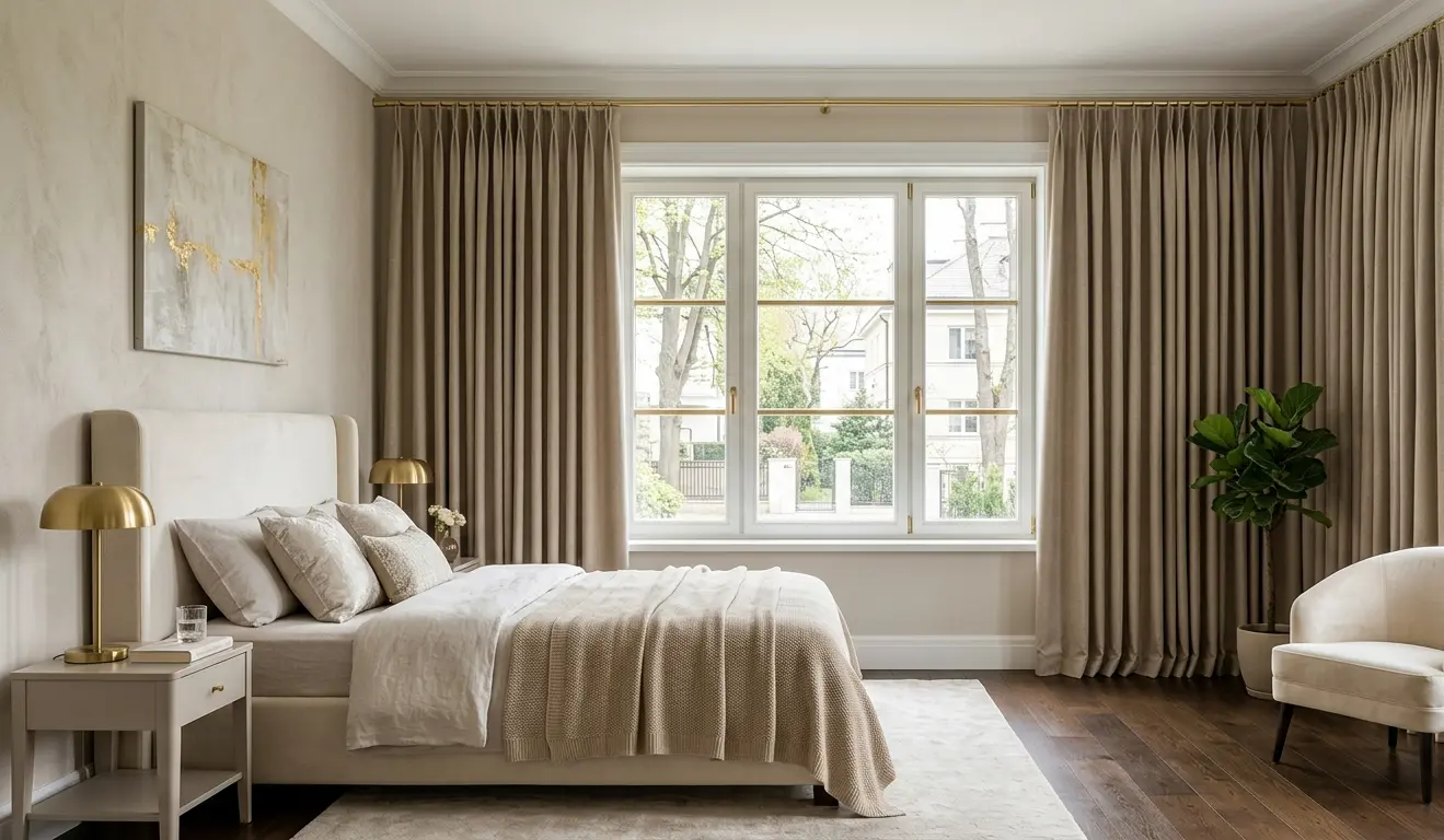 Z moich obserwacji wynika, że najczęściej popełnianym błędem aranżacyjnym są zbyt krótkie zasłony, które zaburzają proporcje. Dla uzyskania luksusowego wyglądu zasłony powinny zawsze dotykać podłogi. Równie istotny jest dobór odpowiedniej tkaniny; w sypialni najlepiej sprawdzają się warianty zaciemniające, które gwarantują komfortowy sen. Pamiętaj, że im grubsza i bardziej mięsista jest struktura materiału, tym lepiej się on układa i prezentuje, podkreślając elegancki charakter całego pomieszczenia.