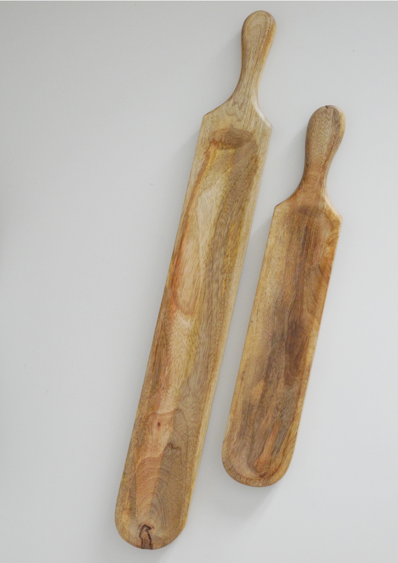 Ten zestaw składa się z dwóch desek o różnych długościach, co pozwala na różnorodność w prezentacji. Pierwsza deska ma długość 61 cm, co sprawia, że jest idealna do układania dłuższych serów, kabanosów czy bagietek. Druga deska jest krótsza, mierzy 42 cm, co sprawia, że jest doskonała do wyłożenia mniejszych przekąsek, jak oliwki, orzechy czy plasterki szynki. W środku mają wydrążone zagłębienie, które ułatwia rozmieszczenie przekąsek oraz zapobiegają rozlaniu się soków z serów czy owoców na stół. Deski różnią się długością dzięki czemu tworzą ciekawy zestaw na stole lub barze. Spora długość pozwala jednorazowo umieścić większą ilość jedzenie.