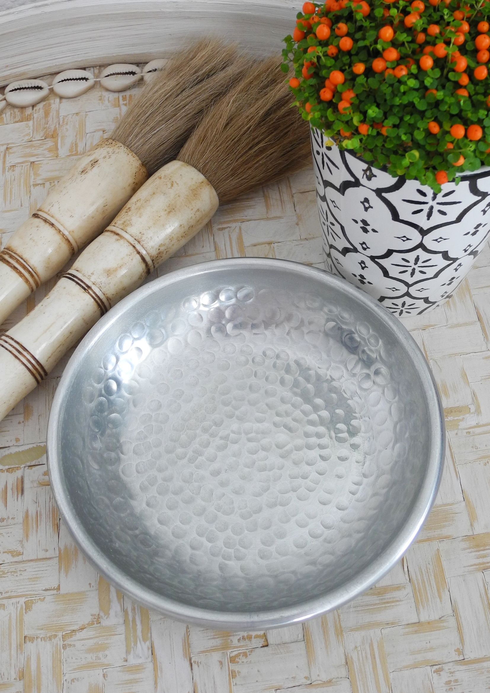 Miseczka z aluminium ORIENT to małe cacko, które łączy tradycję z nowoczesnym stylem. Ręcznie wykonana przez indyjskich rzemieślników, zachwyca prostym klasycznym wzorem młotkowanym i subtelnym połyskiem metalu. Każdy egzemplarz to niepowtarzalny dodatek, który wniesie do Twojego domu klimat dalekich podróży.