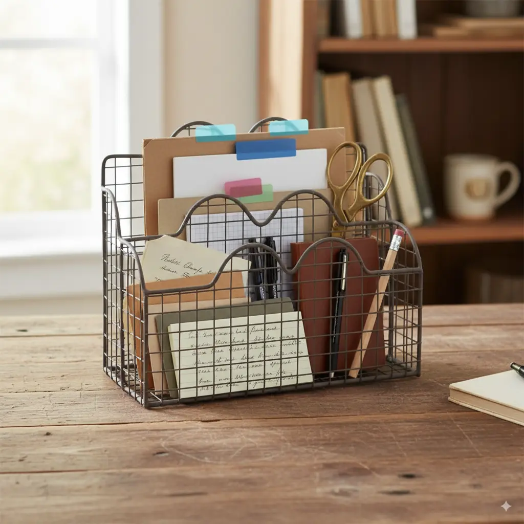 Konstrukcja z metalowej siatki nadaje mu charakter loft i vintage, a faliste krawędzie dodają lekkości i uroku. To nie jest zwykły organizer – to detal, który przyciąga uwagę i pasuje zarówno do nowoczesnych wnętrz, jak i do aranżacji rustykalnych.