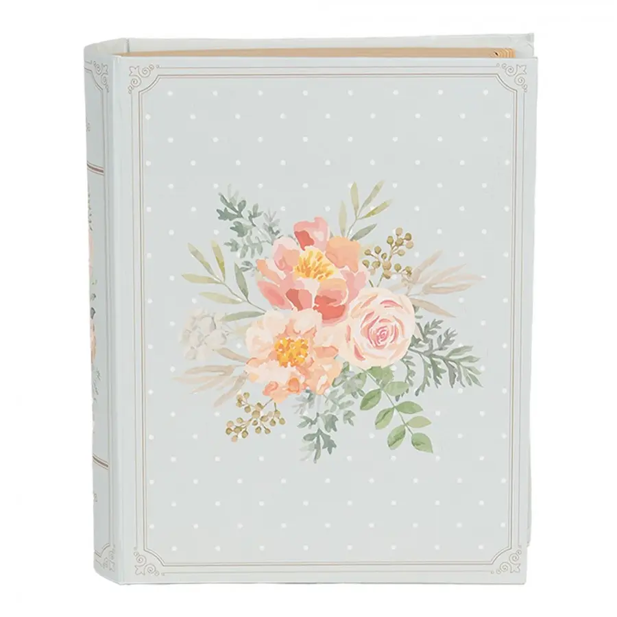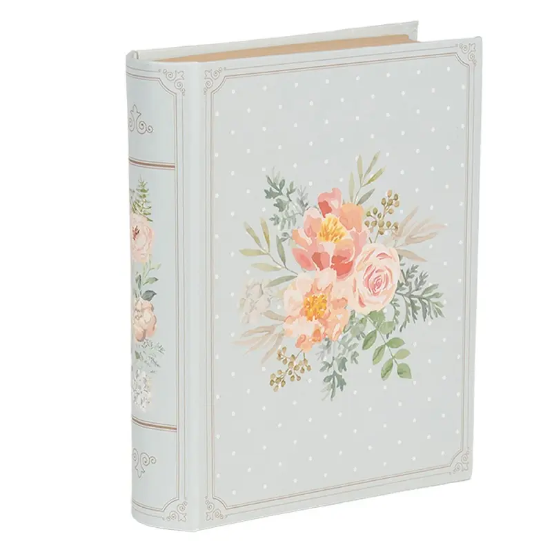 Dekoracyjne pudełko książka Serenity 17x14x5 cm w pastelowym błękicie z kwiatowym motywem. Idealne na drobiazgi i jako elegancka ozdoba.