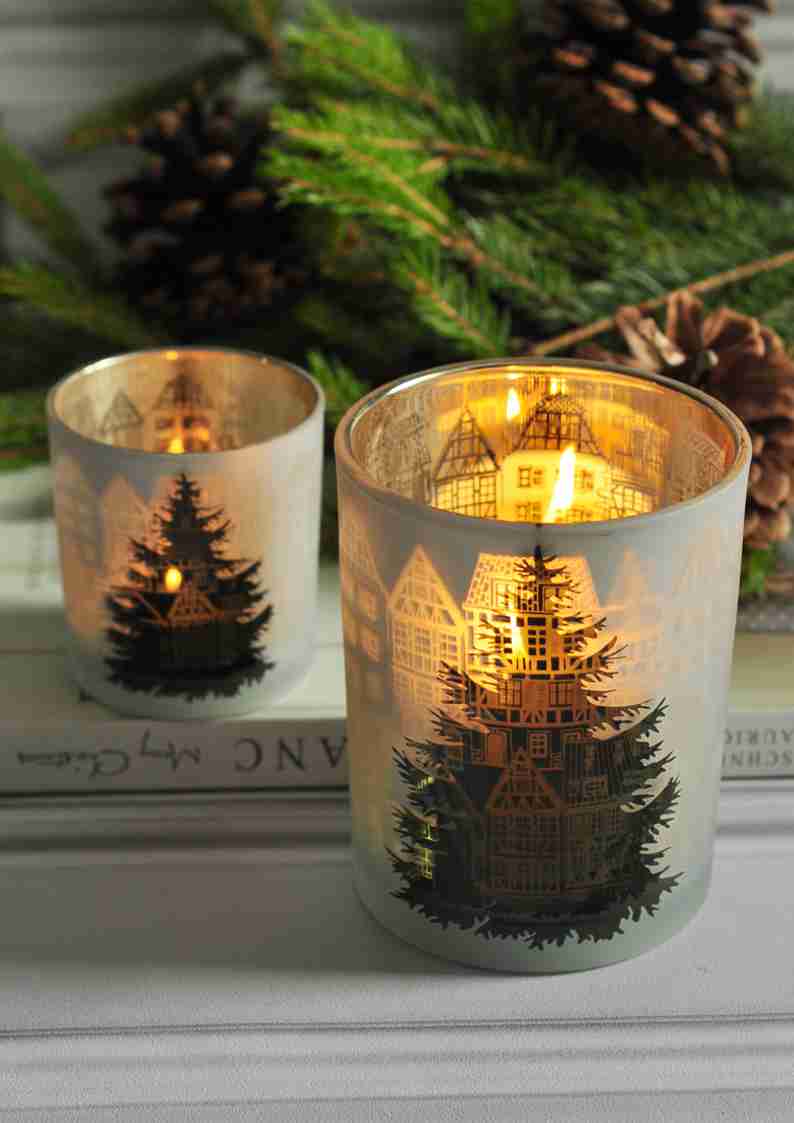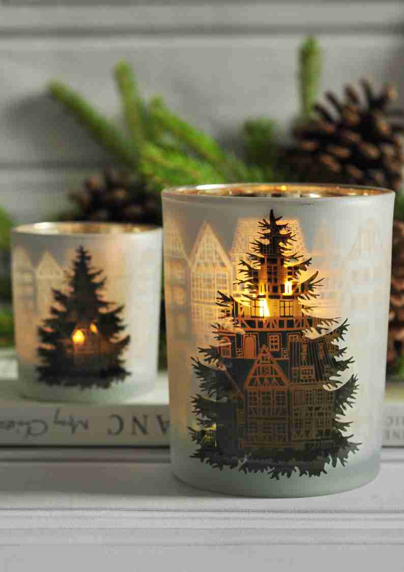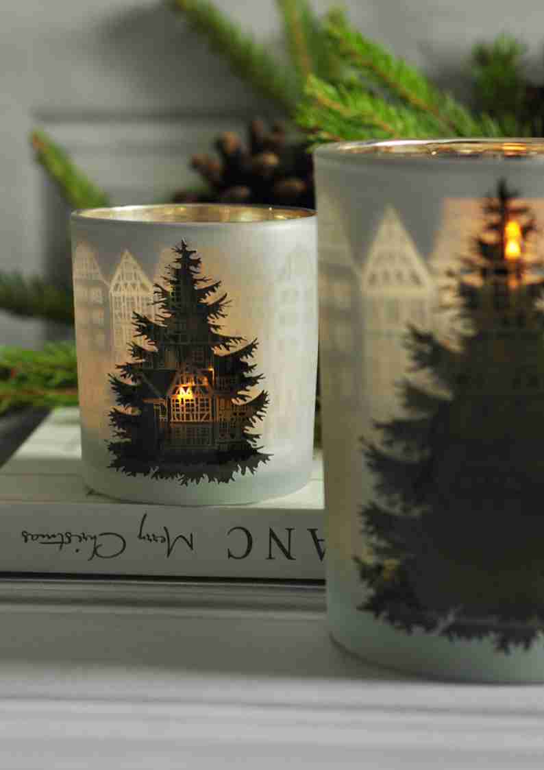 Komplet dwóch szklanych lampionów Christmas City to wyjątkowa dekoracja, która wniesie do wnętrza elegancję i ciepło. Wystarczy zapalić świeczkę, aby choinka na szkle zaczęła lśnić delikatnym światłem i stworzyła bajkowy klimat.