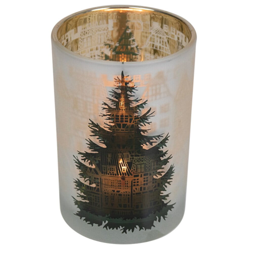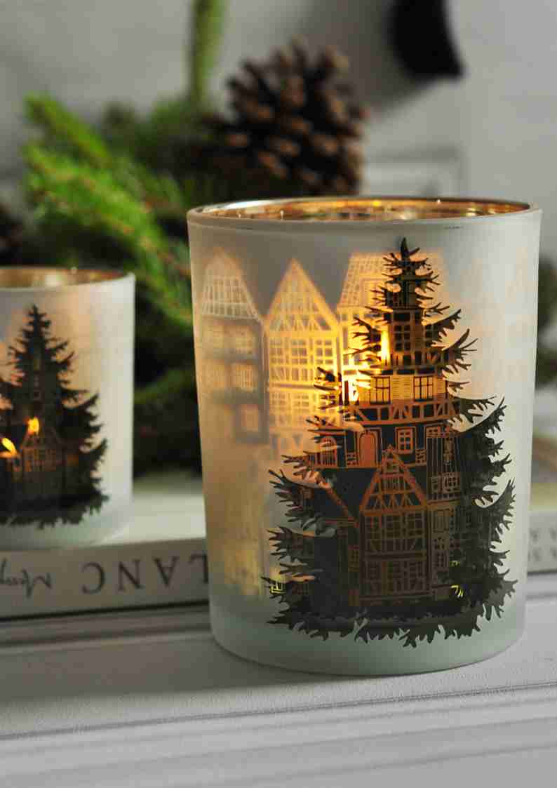 Wnętrze lampionu zdobią urocze holenderskie domki na złotym tle. Po zapaleniu tealightu blask świecy odbija się od szkła i ożywia cały motyw, przypominając zimowe miasteczko o zmroku. To dekoracja, która przyciąga wzrok i buduje magiczną atmosferę.