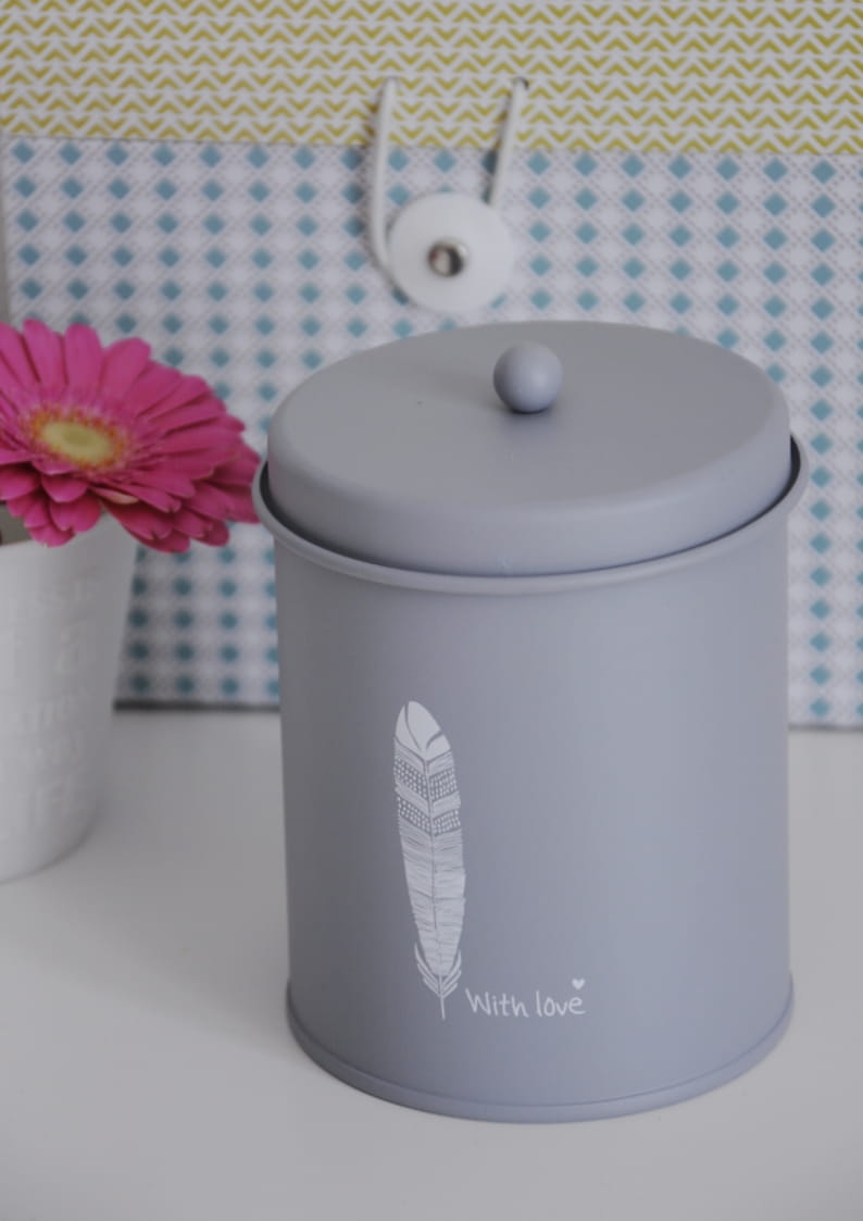 Pojemnik w neutralnej szarości. Metalowa puszka do przechowywania malowana proszkowo na szaro. Zamykana na szczelne wieczko z uchwytem w postaci kulki. Dekoracyjny grafika piórka i tekstu w kolorze białym. Do wykorzystania w kuchni, łazience, pokoju dziecka lub w gabinecie i na biurku.