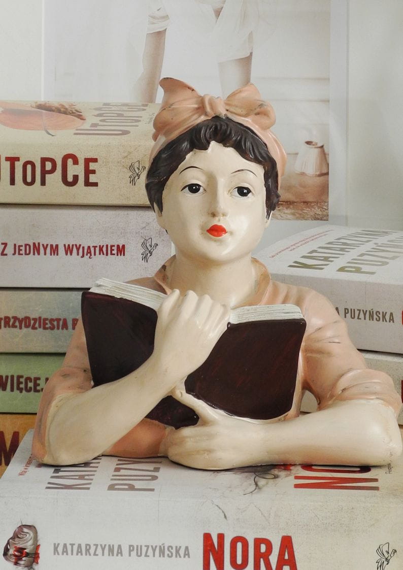 Figurka dekoracyjna dziewczyna z książką. Wykonana z trwałej żywicy, styl vintage. Idealna ozdoba na regał lub prezent dla bibliofila.