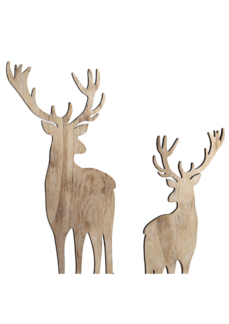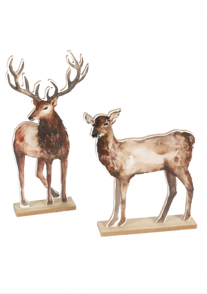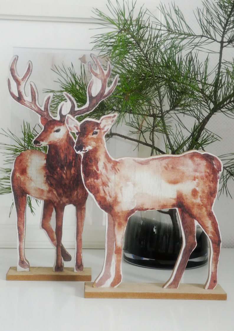 Figurki dekoracyjne jeleń i sarna – naturalna ozdoba z płyty drewnopodobnej na drewnianej podstawie. Subtelny duet, który wprowadza do wnętrza ciepło, spokój i elegancję natury.