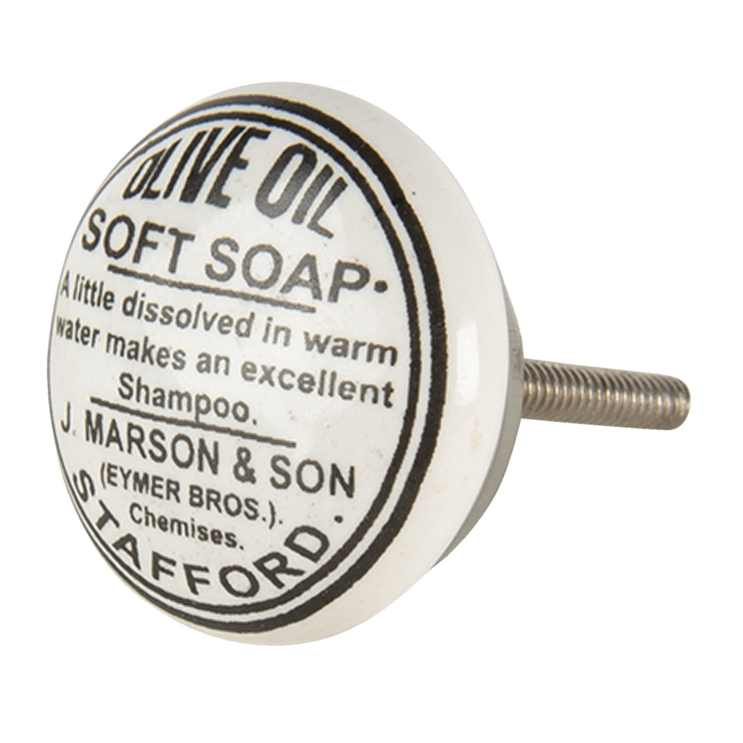 Gałka meblowa ceramiczna SOFT SOAP to połączenie retro stylu z unikalnym designem, które sprawi, że Twoje meble staną się prawdziwą ozdobą przestrzeni. Biała ceramika, czarny napis inspirowany aptecznym retro stylem i srebrne okucie tworzą harmonijną całość, która zachwyci miłośników klasyki i nostalgii.