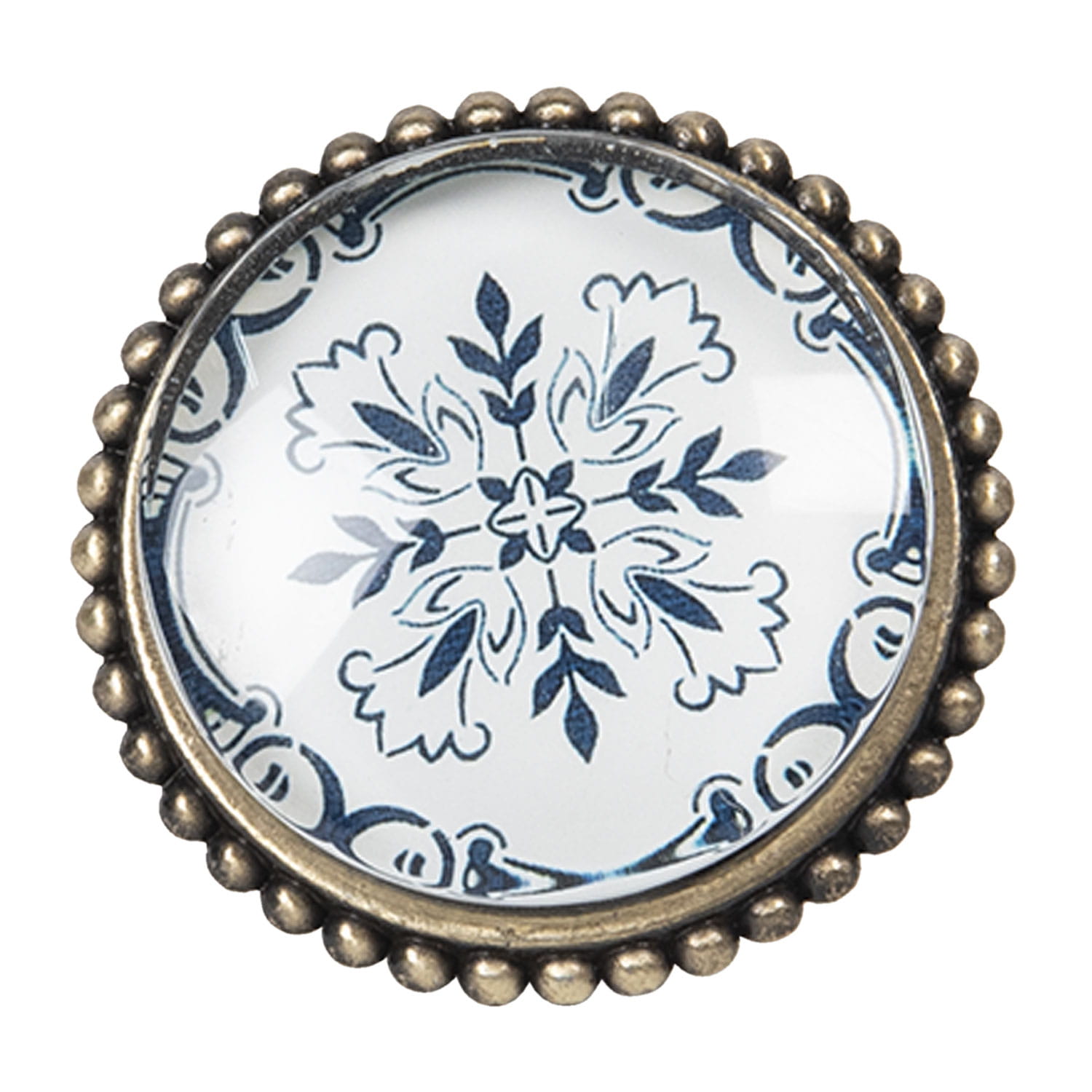 Gałka meblowa w stylu vintage to niezwykle urokliwy dodatek do każdego wnętrza, które potrzebuje odrobiny nostalgii i oryginalności. Szklany kabaszon na grafice w kolorze niebieskim, zdobionej subtelnym wzorem nawiązującym do mozaiki, dodaje temu przedmiotowi wyjątkowej elegancji i wyróżnia go spośród innych.