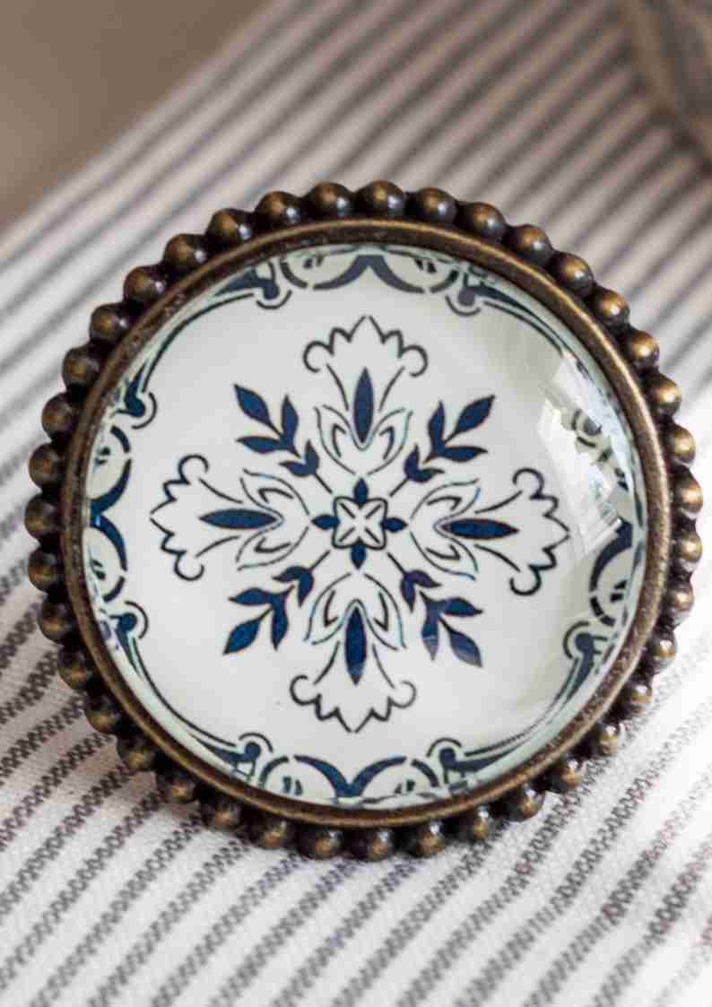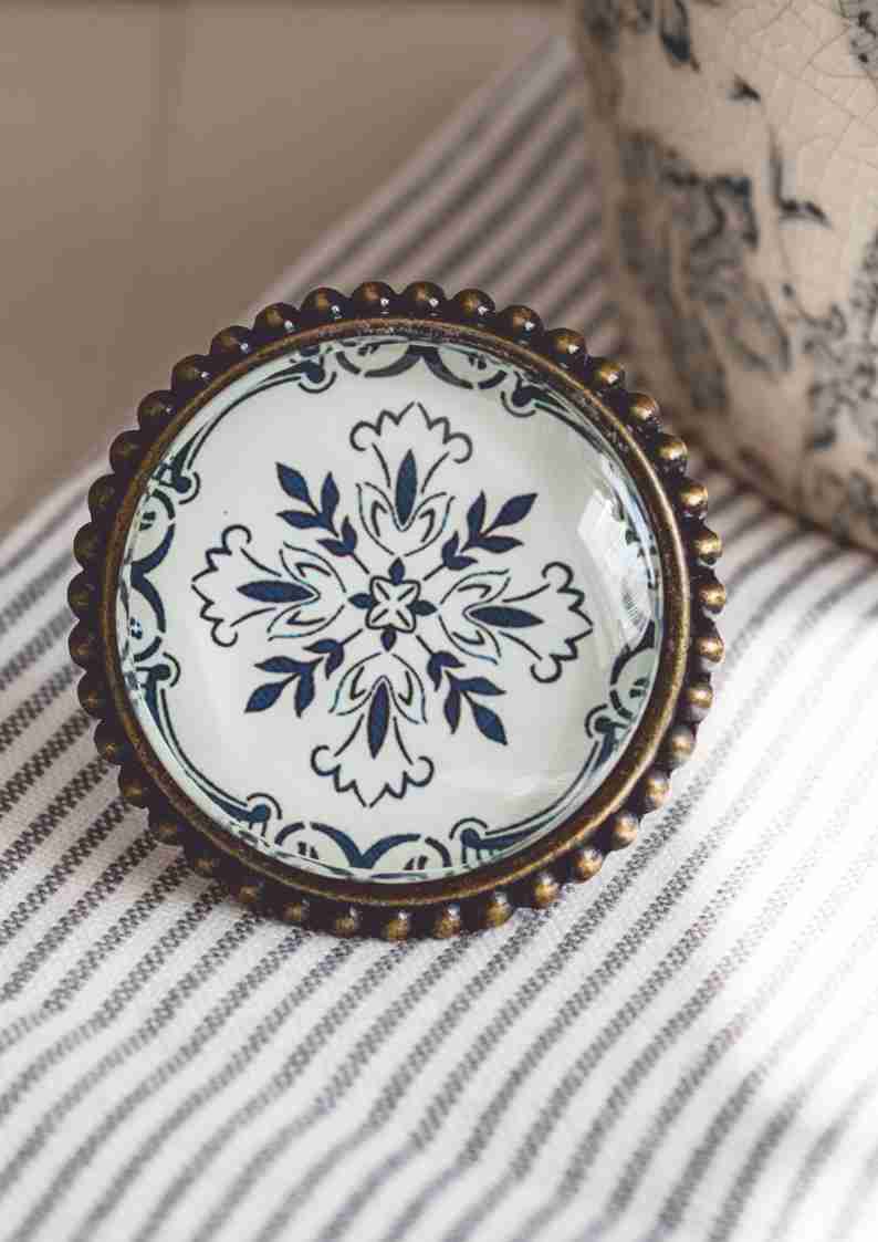 Gałka meblowa w stylu vintage to niezwykle urokliwy dodatek do każdego wnętrza, które potrzebuje odrobiny nostalgii i oryginalności. Szklany kabaszon na grafice w kolorze grafitowym, zdobionej subtelnym wzorem nawiązującym do mozaiki, dodaje temu przedmiotowi wyjątkowej elegancji i wyróżnia go spośród innych.