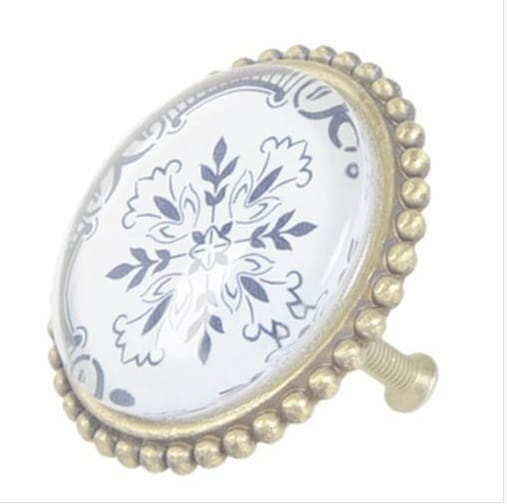 Do wnętrz w stylu romantycznym albo vintage polecamy metalową gałkę ze szklanym oczkiem. Gałka wykonana jest z metalu, w kolorze starego złota. Środek stanowi dekor przykryty wypukłym, szklanym kabaszonem.