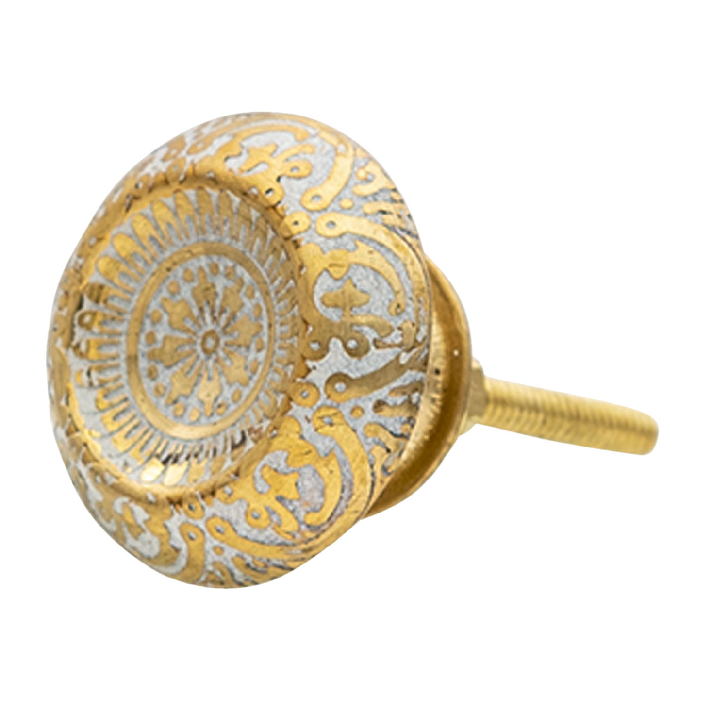 Jej kształt przypomina tradycyjną gałkę, ale to jej wzór nawiązuje do orientalnych motywów,. Na powierzchni gałki meblowej widoczny jest bogaty, delikatny wzór z elementami inspirowanymi wschodnią ornamentyką. Wzór ten jest wyraźnie wytłoczony, co dodaje tekstury i głębi gałce.Wyjątkowa forma z ciekawym zagłębieniem pośrodku. Dość bogaty ornament oraz tło pokryte są patyną.