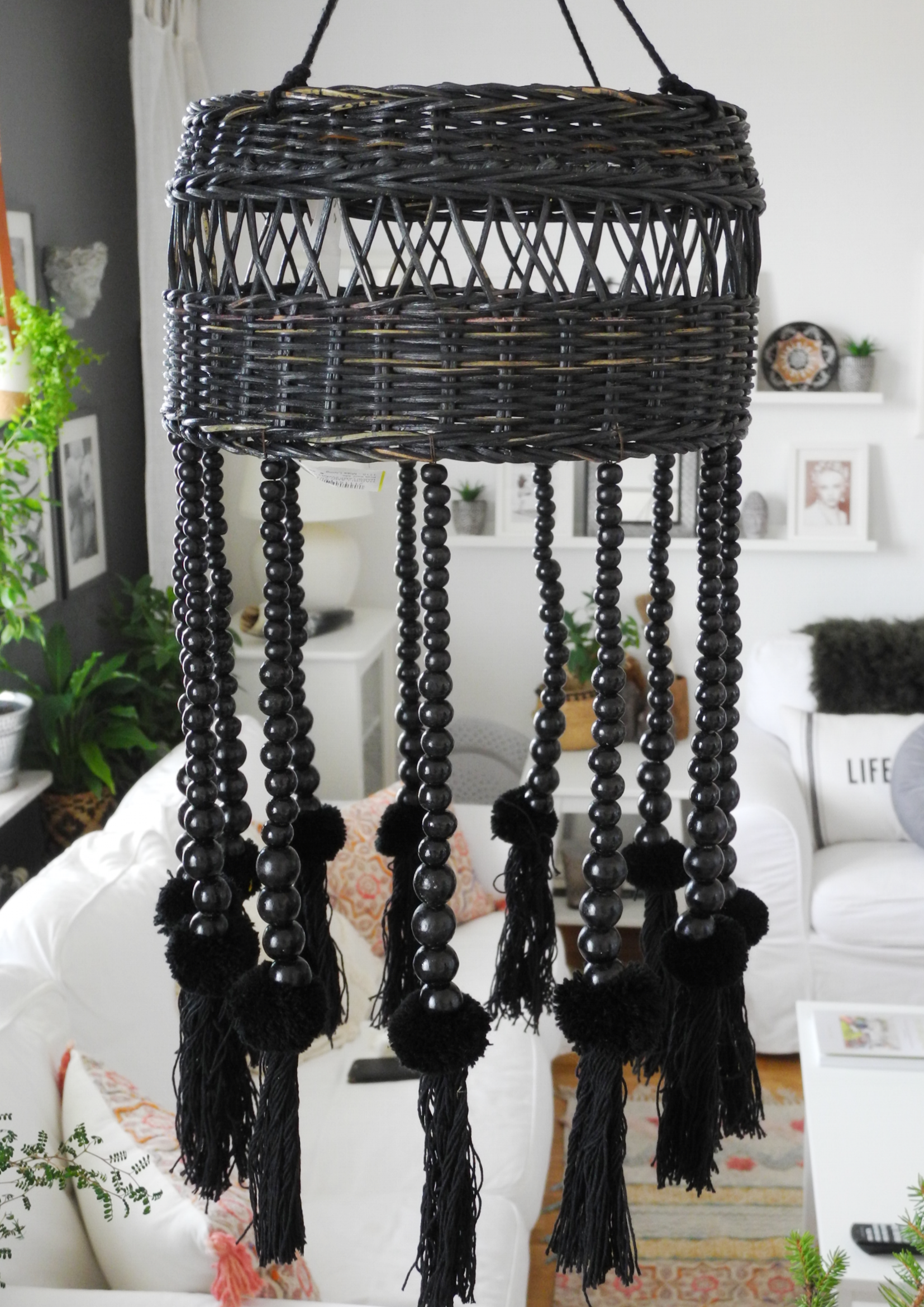 Czarny abażur boho z wikliny, koralikami i frędzlami. Elegancka lampa wisząca, która doda wnętrzu przytulności i wyjątkowego klimatu.