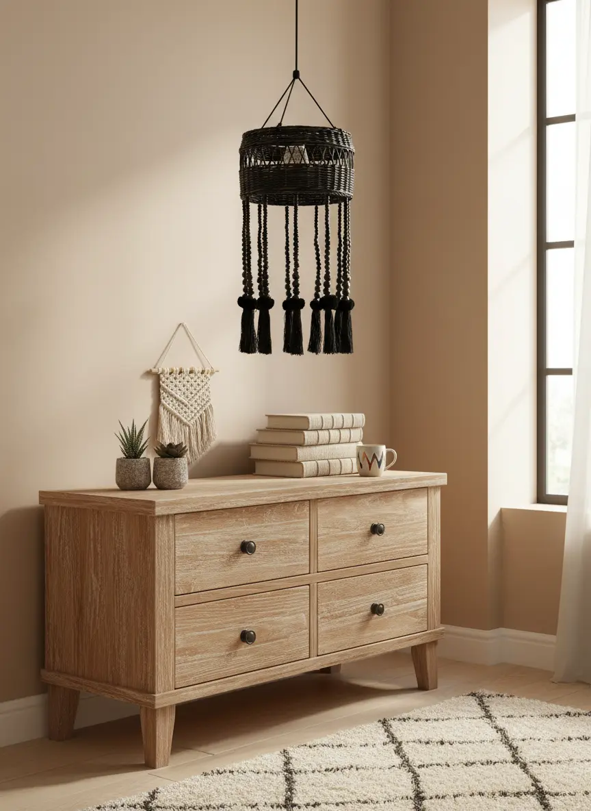 Styl Boho z nutą elegancji: Czarny kolor i naturalne materiały tworzą unikalne połączenie.