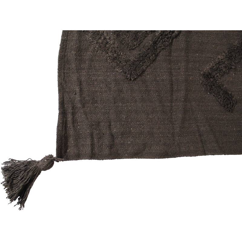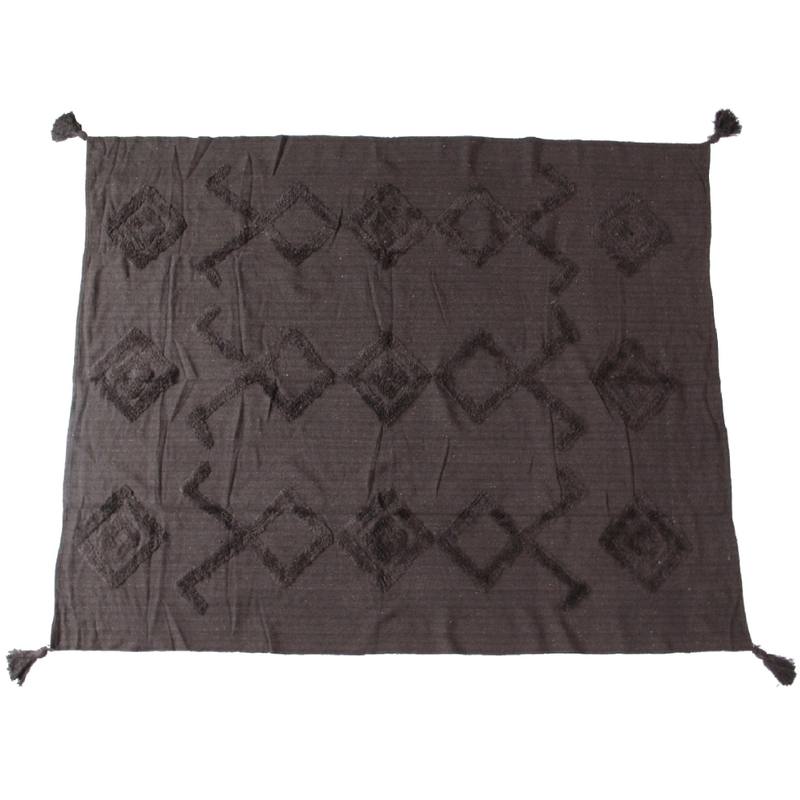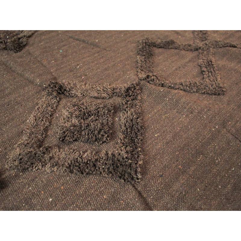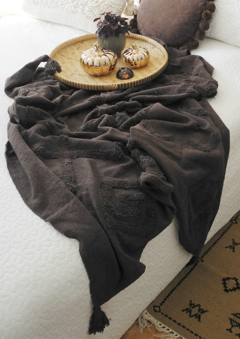 Pled w berberyjskim stylu zachwyca tuftowanym, wypukłym wzorem geometrycznym, który dodaje mu charakteru i unikalnego wyglądu. Ręcznie wykonane chwosty na rogach podkreślają jego rękodzielniczy urok i nawiązują do stylu boho. Delikatne jaśniejsze punkciki na tle czekoladowego brązu nadają mu subtelnego, naturalnego efektu.