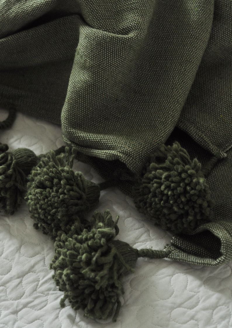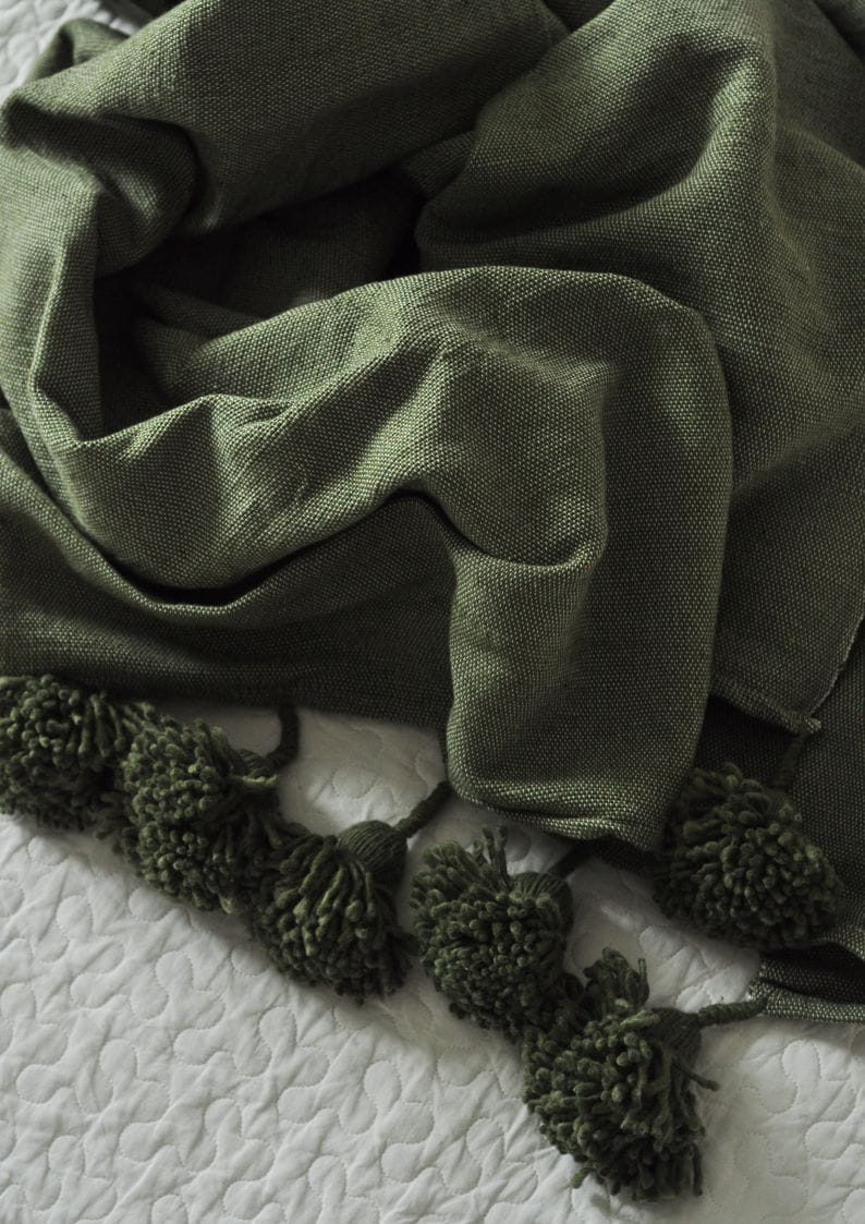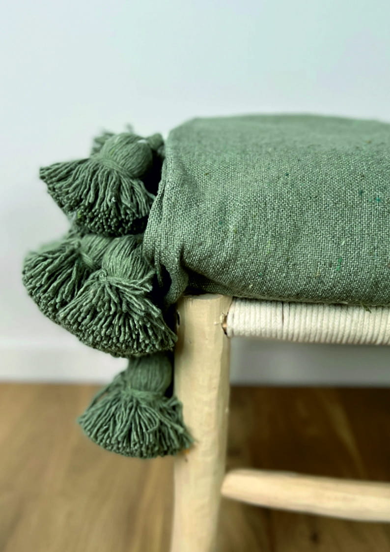 Bawełniany zielony pled z pomponami w stylu boho Green. Naturalna, oddychająca bawełna, szałwiowy kolor i ręczne wykonanie. Idealny do salonu i sypialni.
