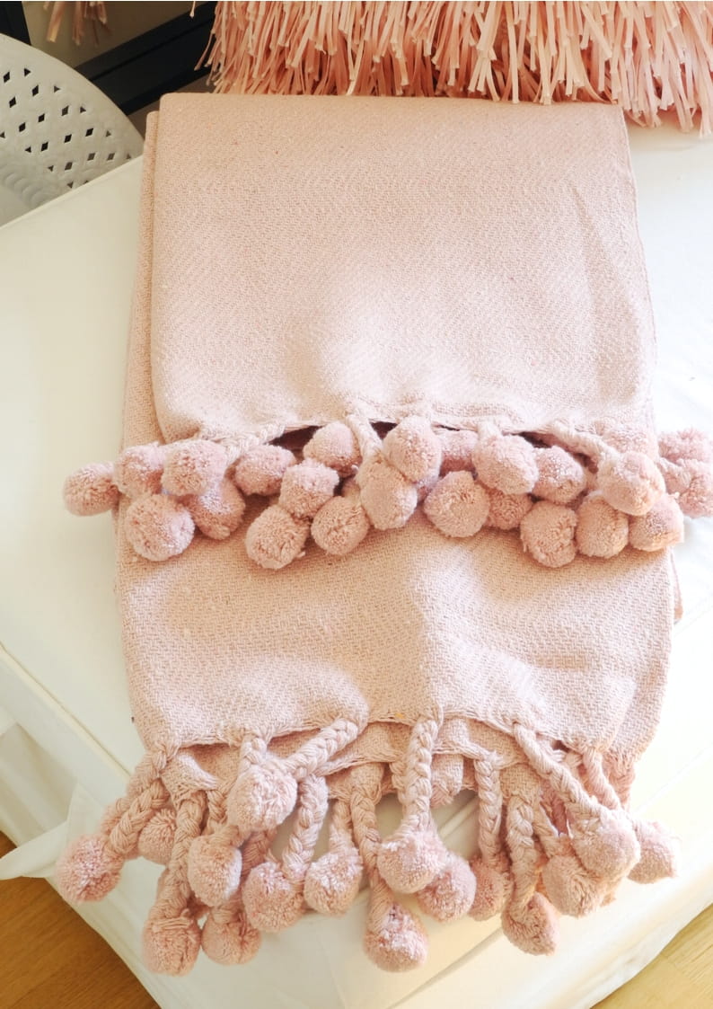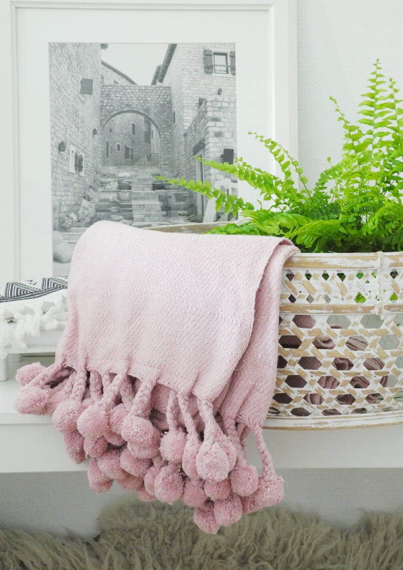 Bawełniany różowy koc z pomponami – Przytulność w stylu boho!