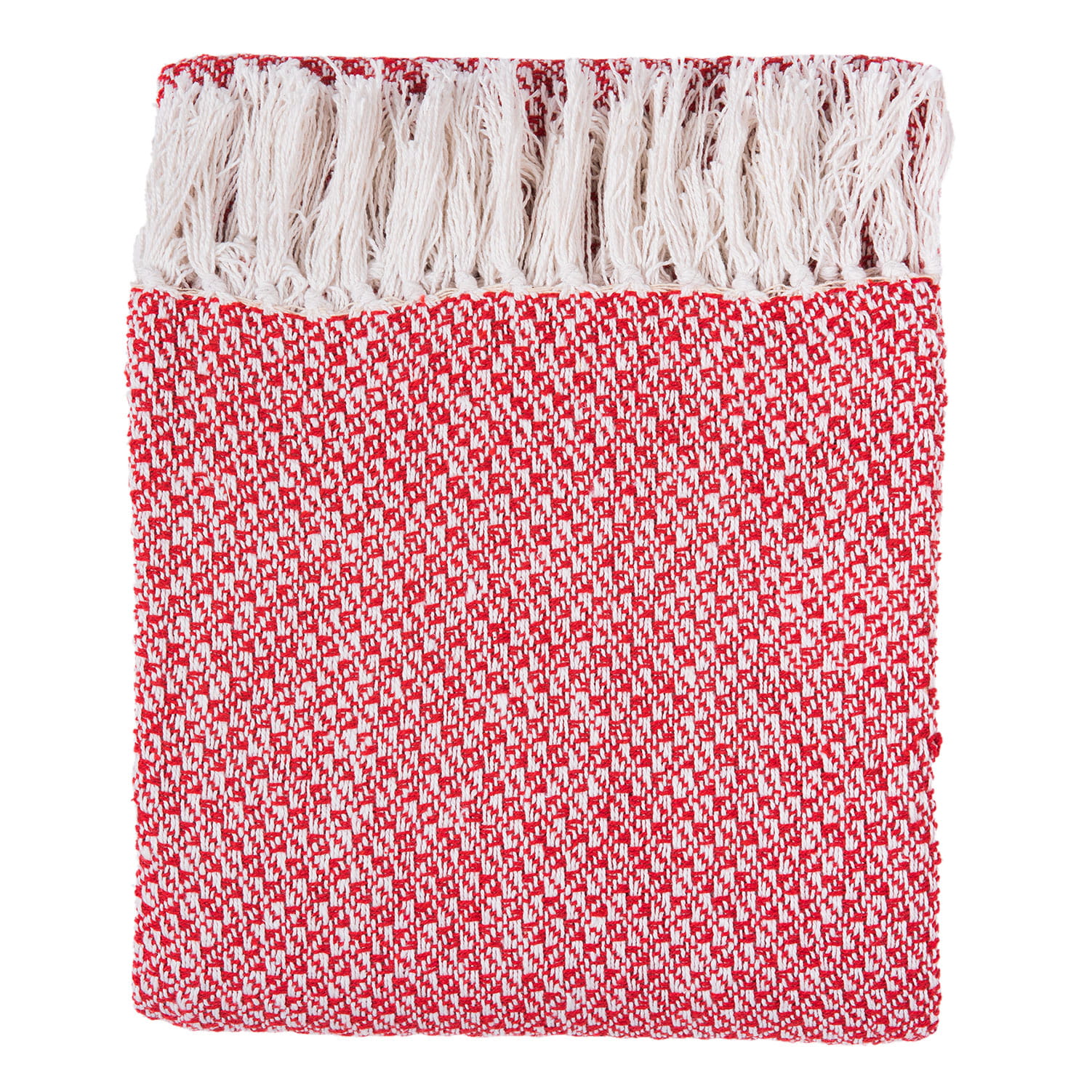 Koc tkany czerwono-biały z frędzlami – przytulny dodatek do wnętrza