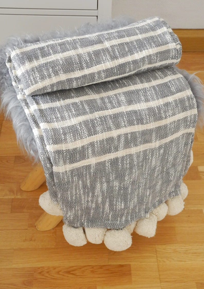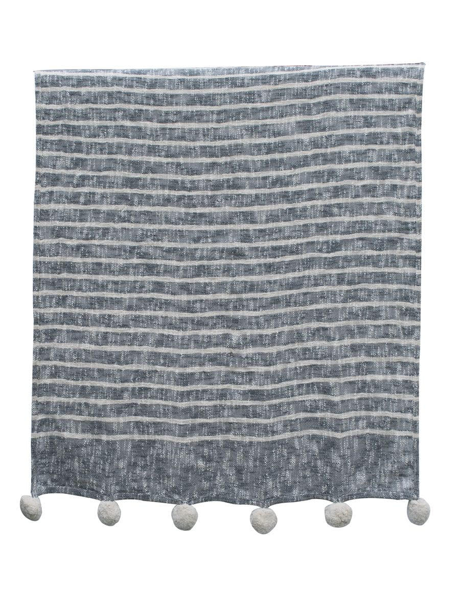 Pled bawełniany szary w białe pasy z pomponami - RUTNA GREY