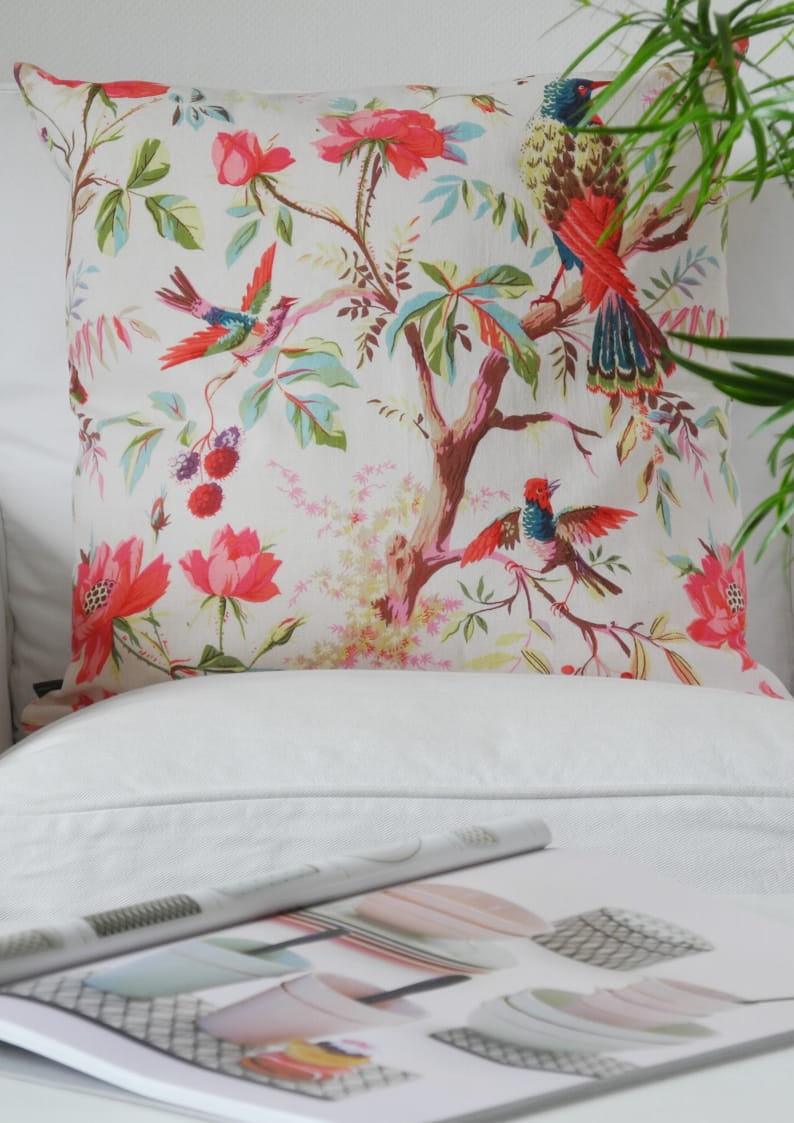 Poduszka dekoracyjna w kwiaty i ptaki, czyli bilet pierwszej klasy do tropików