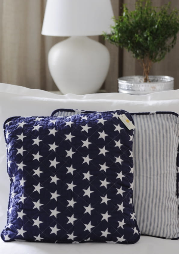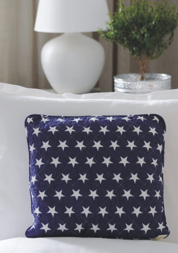 Poszewka bawełniana 40x40 cm w gwiazdki to dwustronna poszewka dekoracyjna z naturalnej bawełny, idealna do salonu, sypialni lub na balkon. Pikowana struktura, wiązanie na troczki oraz wzór w gwiazdy i paski pozwalają łatwo zmienić aranżację wnętrza. Produkt sprzedawany bez wypełnienia.