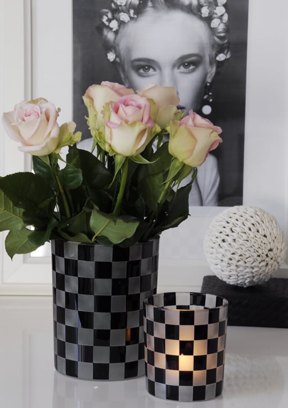Dodaj swojemu wnętrzu wyjątkowego charakteru dzięki szklanemu pojemnikowi SQUARES w modny wzór czarno-białej szachownicy. To elegancka dekoracja glamour, która świetnie sprawdzi się zarówno jako ozdobny pojemnik, jak i świecznik na tealight. Geometryczny wzór przyciąga uwagę i nadaje wnętrzu nutę nowoczesnej elegancji.