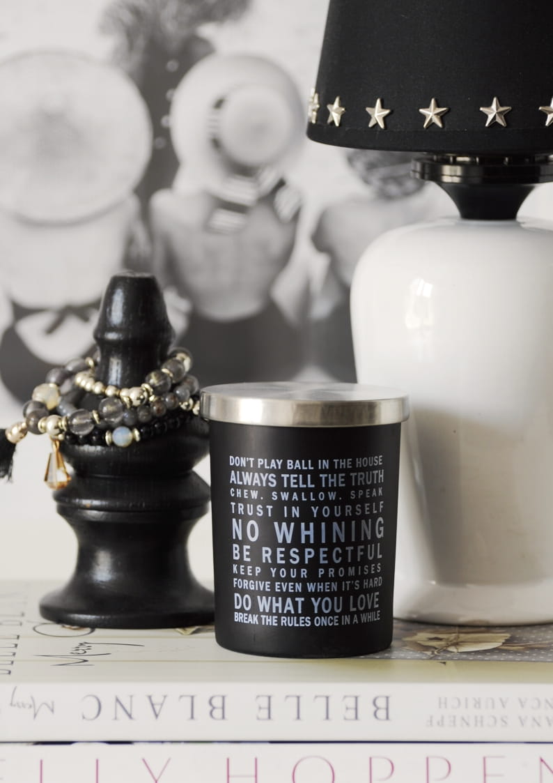 Świeca w czarnym pojemniku biały tekst RULES