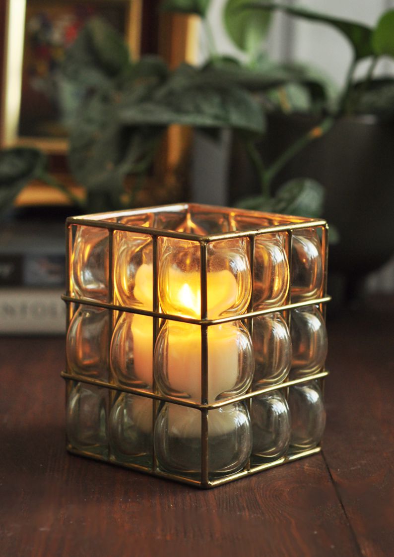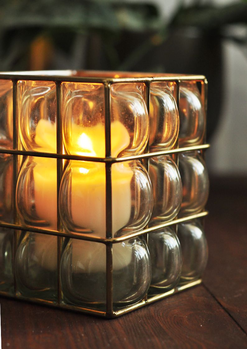 Świecznik szklany CLARA w metalowej ramie stare złoto. Elegancki dodatek, który rozprasza światło świecy i tworzy nastrojową atmosferę w każdym wnętrzu.
