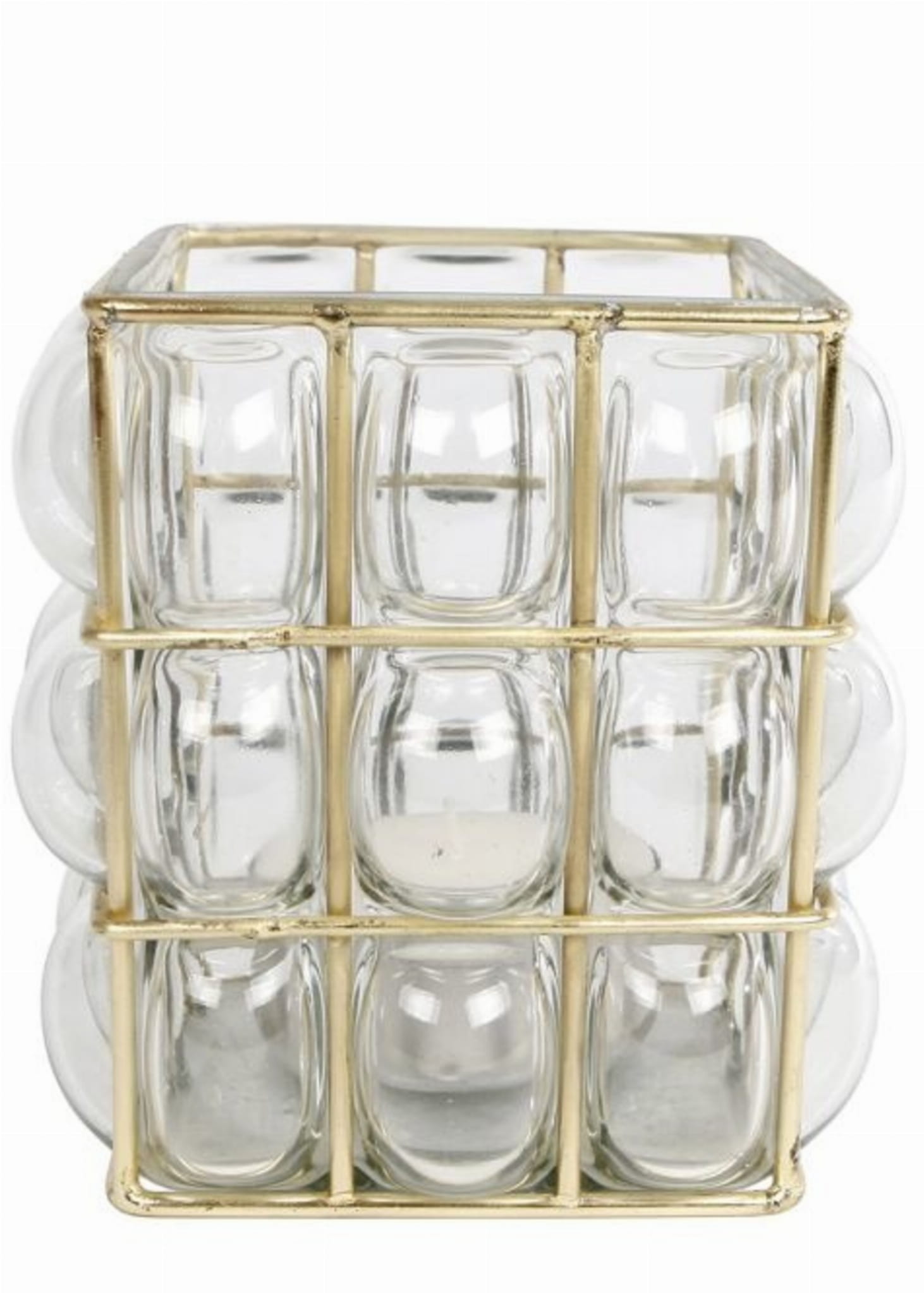 Świecznik szklany w metalowej ramie stare złoto – Clara
