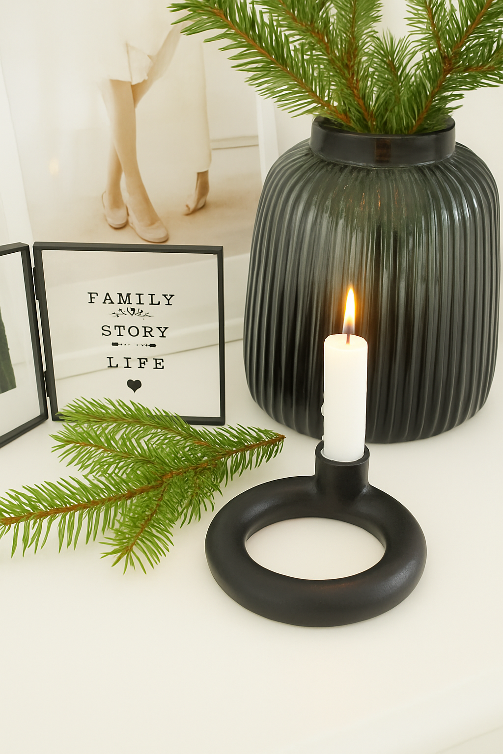 Czarny świecznik Ivo to propozycja dla osób ceniących prostotę i funkcjonalność. Jego subtelna konstrukcja świetnie prezentuje się zarówno na stole w jadalni, komodzie w salonie, jak i na parapecie w sypialni. Możesz ustawić go samodzielnie lub w towarzystwie innych świeczników, tworząc efektowną dekorację.