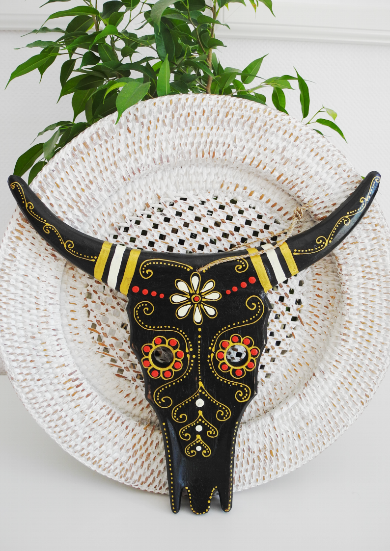 „BUFALO” to połączenie boho z nutką elegancji i egzotyki, które doskonale pasuje do wnętrz pełnych naturalnych materiałów, etnicznych wzorów i artystycznych akcentów. Wykonana z drewna głowa byka w czerni i kolorowych ornamentach wprowadza do przestrzeni odrobinę dzikiego uroku, który nie jest przesadzony, a przyciąga wzrok. Wpasuje się w przestrzeń zarówno nowoczesną, jak i klasyczną, tworząc piękny kontrast z otoczeniem, a zarazem wprowadzając ciepło i przytulność. Jest to dekoracja, która nadaje się do salonu, jadalni, czy nawet korytarza, ożywiając te miejsca i nadając im niepowtarzalny styl.
