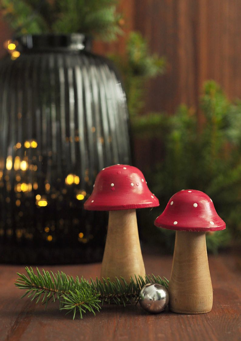 Drewniane muchomory to dekoracja, która przenosi w świat ciepłych wspomnień i naturalnego piękna. Ręcznie wykonane z drewna, z czerwonymi kapeluszami i białymi kropkami, wyglądają jak wyjęte z leśnej bajki. Przywodzą na myśl dawne ozdoby choinkowe i klasyczne świąteczne ilustracje. Dziś znów wracają do wnętrz – w eleganckim, rustykalnym wydaniu.