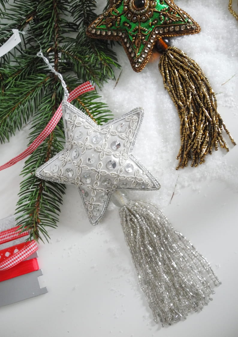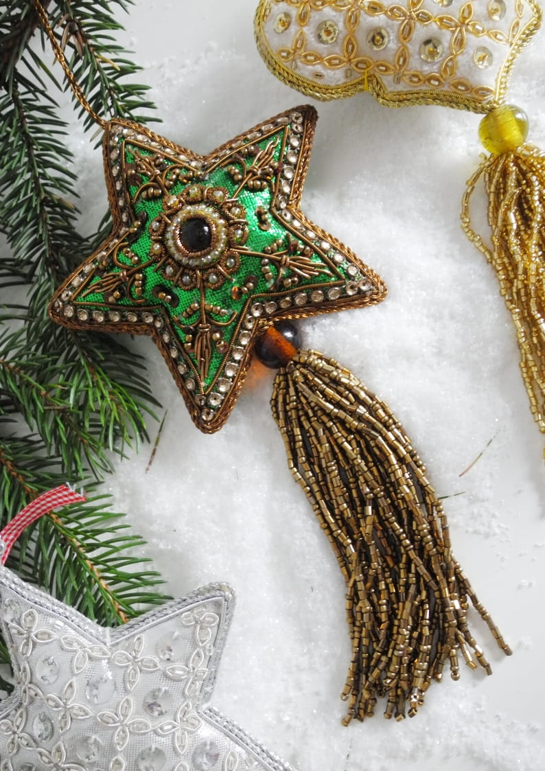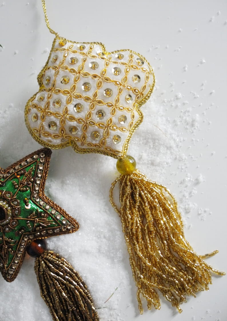 Dekoracyjne zawieszki świąteczne w wyjątkowym stylu. Mogą pełnić funkcję ozdobnych chwostów do kluczy lub uchwytów meblowych. Wykonane z tkanin naszywanych cekinami i koralikami. Wykończone chwostami z drobnych koralików. Trzy różne wzory.