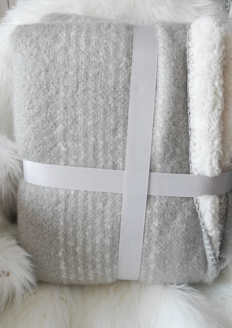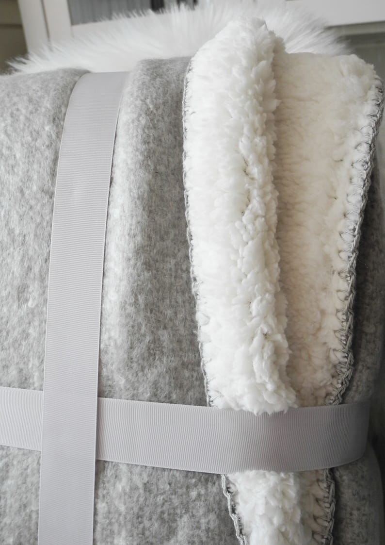 Koc wykonany jest z dwóch różnych materiałów, które zapewniają niezrównaną miękkość i przyjemność w dotyku. Jedna strona to biały, puszysty baranek, który otula Cię delikatnością, a druga strona to włóczka akrylowa w odcieniach szarości i kremu – eleganckie połączenie kolorów, które wprowadza harmonię i spokój do wnętrza.