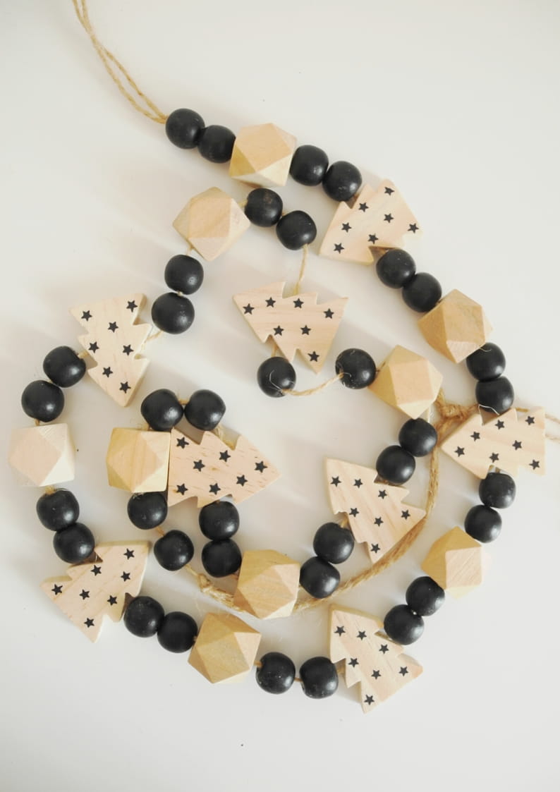 Drewniana girlanda świąteczna z czarnymi koralikami i choinkami – naturalna ozdoba do zawieszenia. Styl skandynawski, ciepły akcent do świątecznego wnętrza.