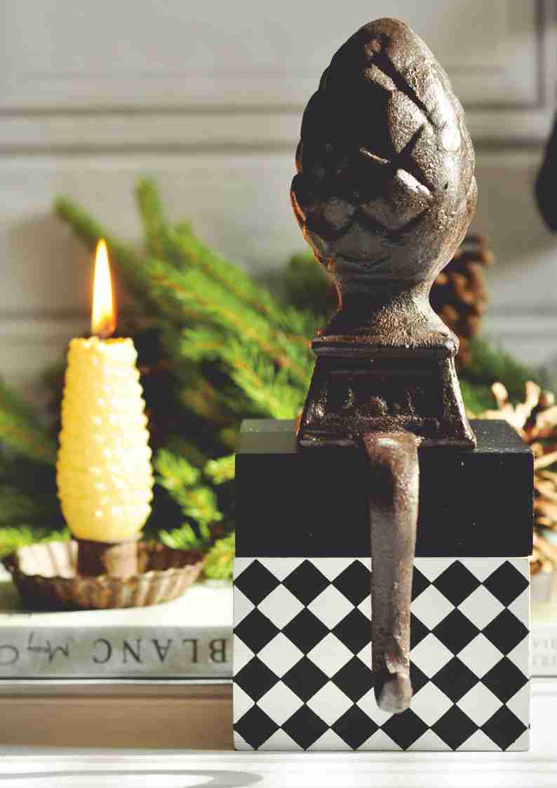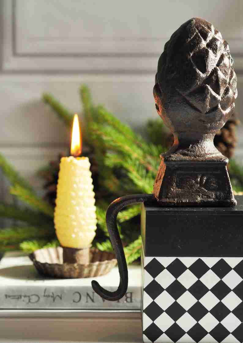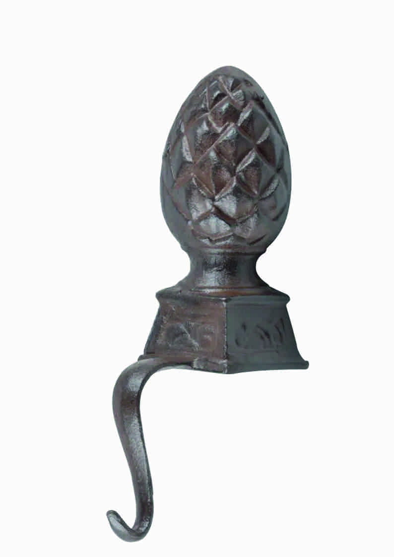 Żeliwny wieszak świąteczny w kształcie szyszki. Stabilny i dekoracyjny – idealny do skarpet, wieńców i girland na kominku lub półce.