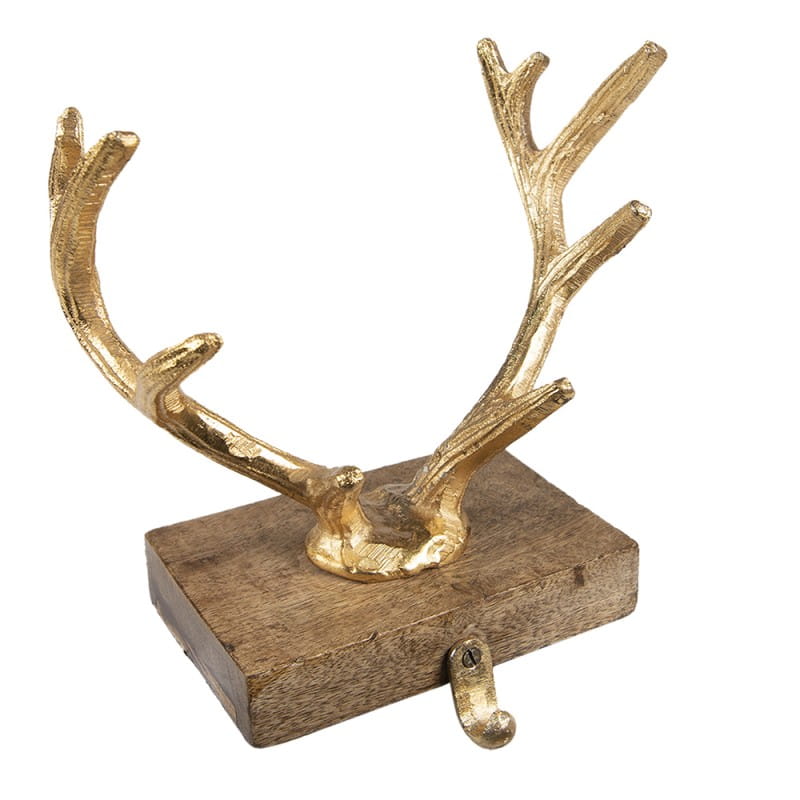 Wieszak na skarpety świąteczne to stylowy sposób na wyeksponowanie skarpet, wianków lub innych zimowych dekoracji. Złote poroże na drewnianej podstawie wprowadza do wnętrza świąteczną elegancję z nutą rustykalnego uroku.