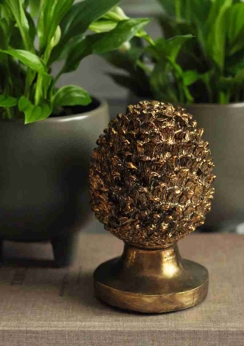 Złota dekoracja w kształcie szyszki na stojaku w stylu vintage. Elegancka ozdoba w kolorze starego złota, idealna na święta i do całorocznych aranżacji. Dodaje wnętrzu klasy i ciepłego blasku.