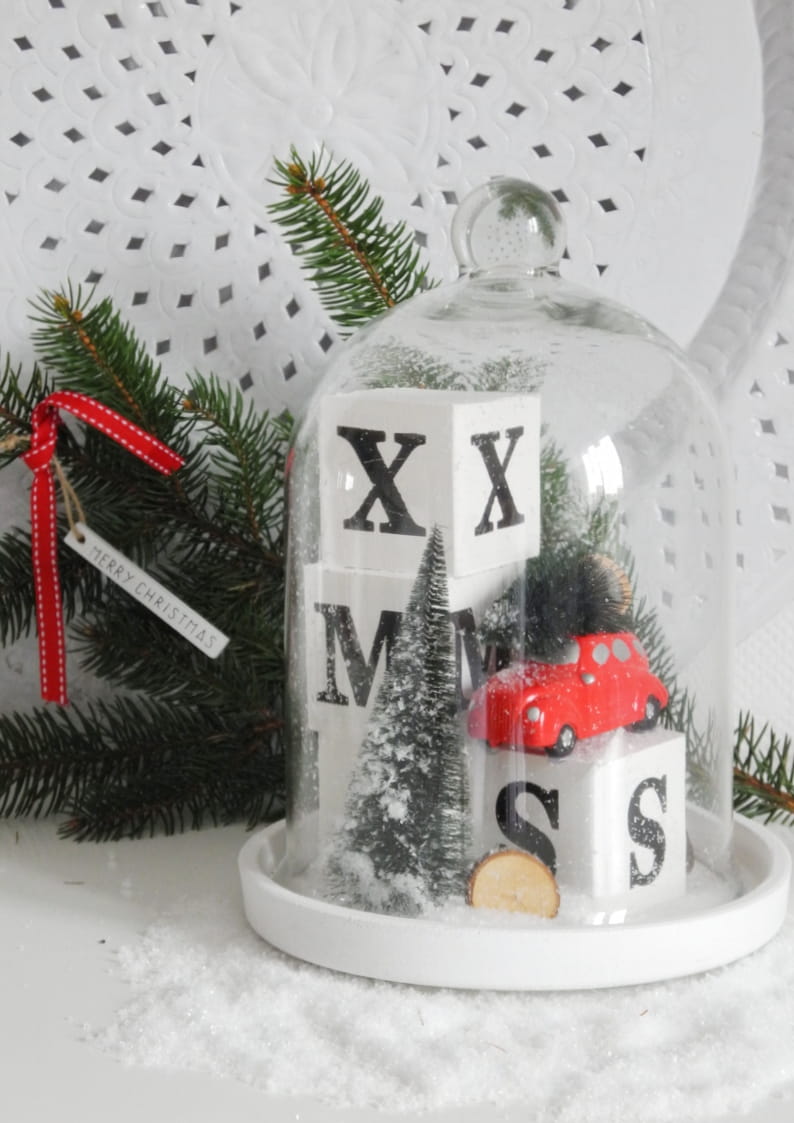 Świąteczna dekoracja pod kloszem z choinką i czerwonym samochodzikiem - KLOSZ
