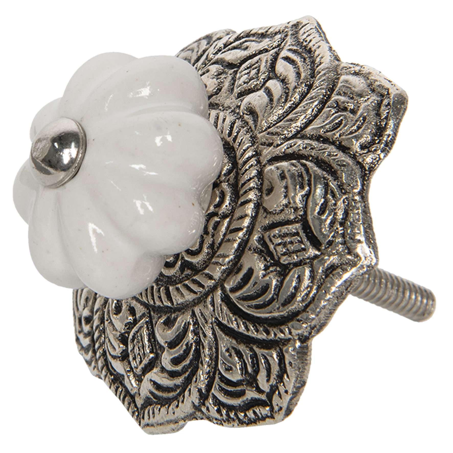 Ta ceramiczna gałka do mebli w klasycznym białym kolorze to prawdziwa perełka. Dookoła ceramicznego środka zamocowano metalową rozetę w stylu orientalnym, która dodaje nutkę elegancji i oryginalności. Srebrne wykończenia doskonale komponują się z każdym stylem – czy to nowoczesnym, czy vintage. To mały detal, który robi wielką różnicę!