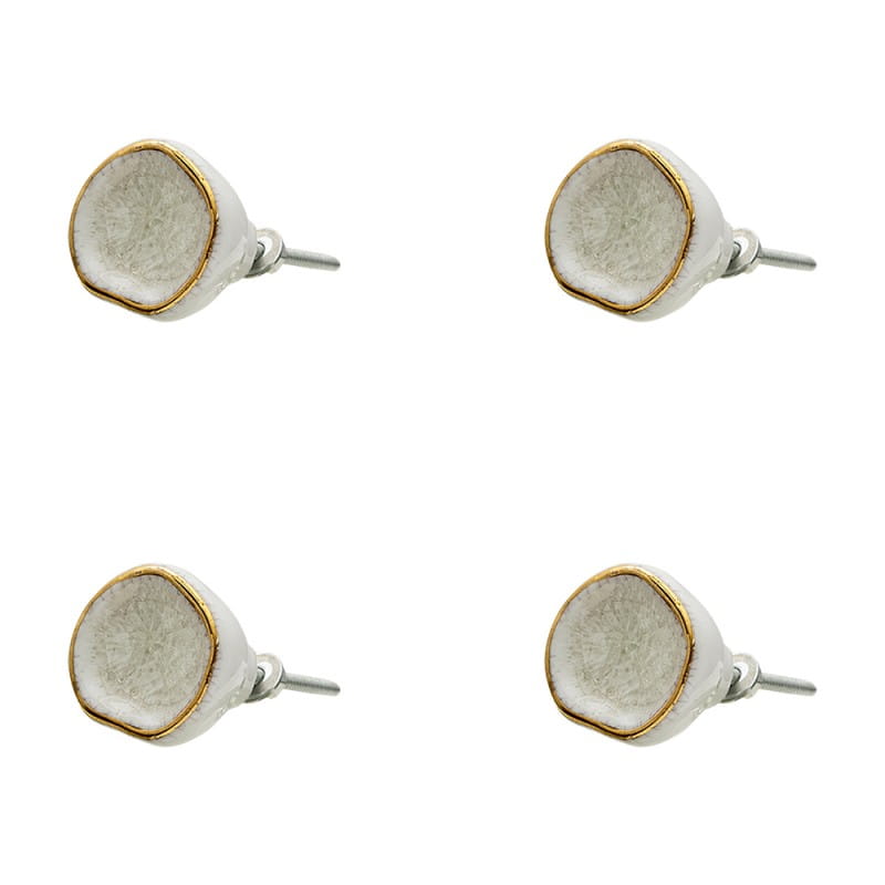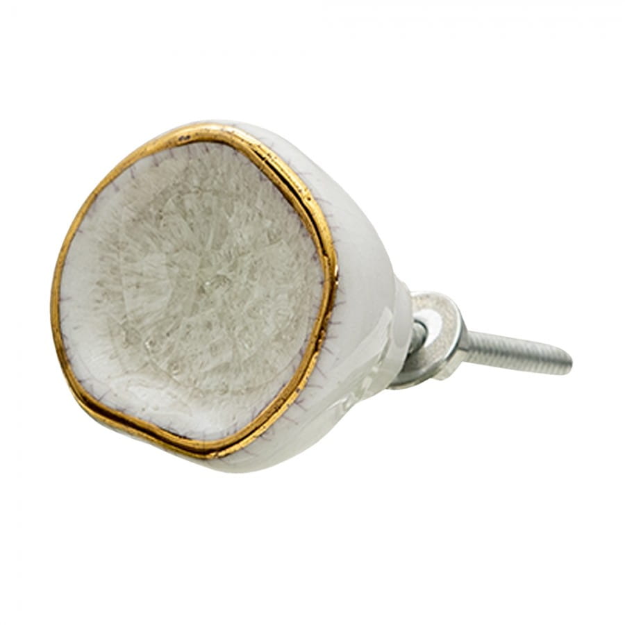 Ceramiczna gałka meblowa o organicznym kształcie, spękanym dekoracyjnym środku oraz eleganckim obramowaniem w kolorze białego złota to wyjątkowy element wyposażenia wnętrza, który nadaje meblom niepowtarzalny charakter. Ta gałka to połączenie naturalnego designu z elegancją, co sprawia, że doskonale wpisuje się w różnorodne style wnętrz.