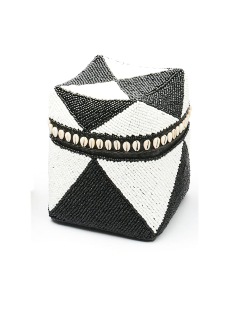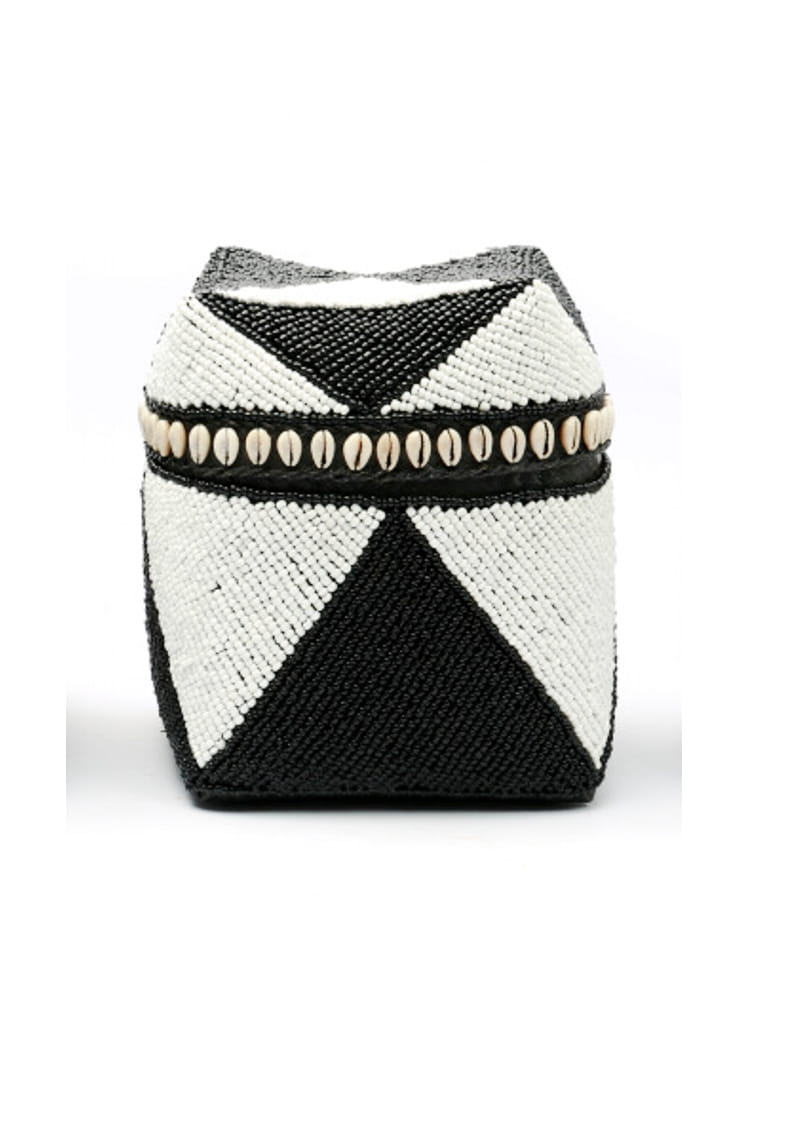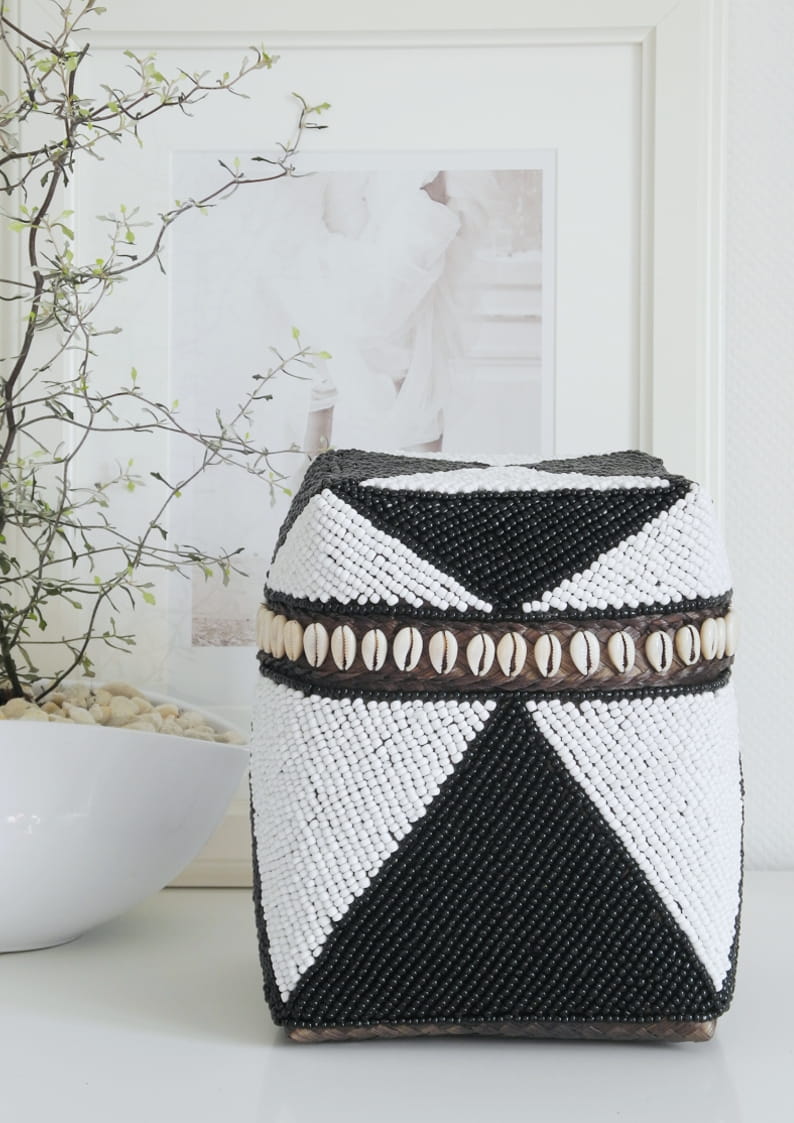 Ten koszyk to prawdziwa ozdoba, która przyciąga wzrok i nadaje wnętrzu wyjątkowego charakteru. Ręcznie naszywane koraliki w kolorach czarnym i białym tworzą misterny wzór, który wprowadza elegancję i subtelną harmonię. Koszyk jest zamykany wieczkiem, które dodatkowo zdobi delikatny wzór z małych muszelek, podkreślając jego unikalny styl.